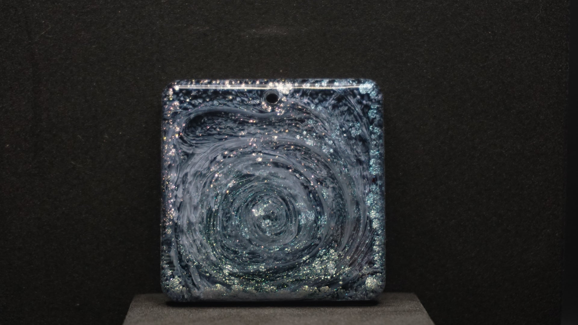 All of our pieces are resin based, featuring a variety of shimmery/sparkly mica backdrops, alcohol ink, and hand painted designs. At this time we are only including personalization on the back of the tag to not compete with the design. Most alcohol ink tags are backed in either black or white depending on what we feel works the best.