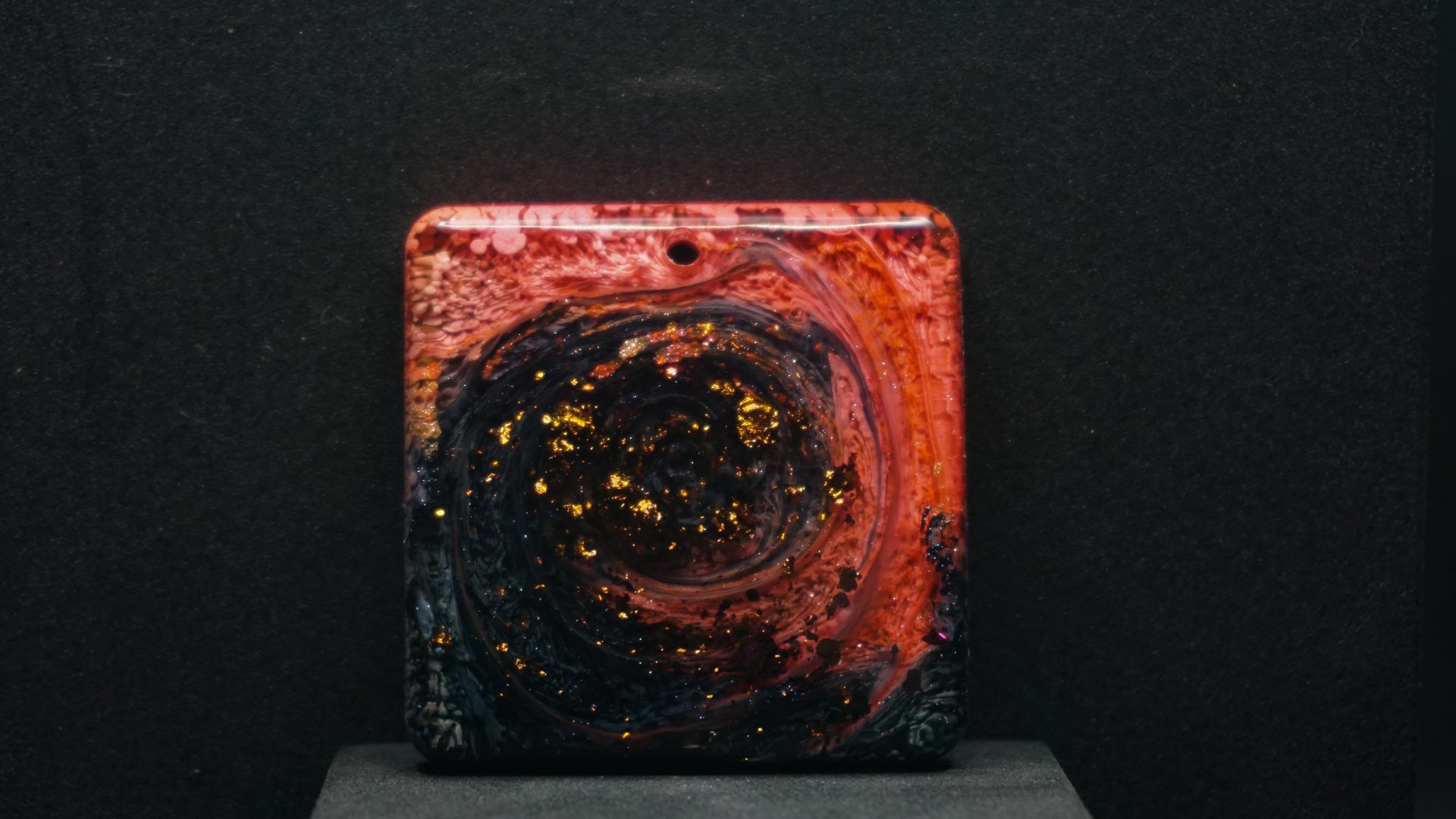 All of our pieces are resin based, featuring a variety of shimmery/sparkly mica backdrops, alcohol ink, and hand painted designs. At this time we are only including personalization on the back of the tag to not compete with the design. Most alcohol ink tags are backed in either black or white depending on what we feel works the best.