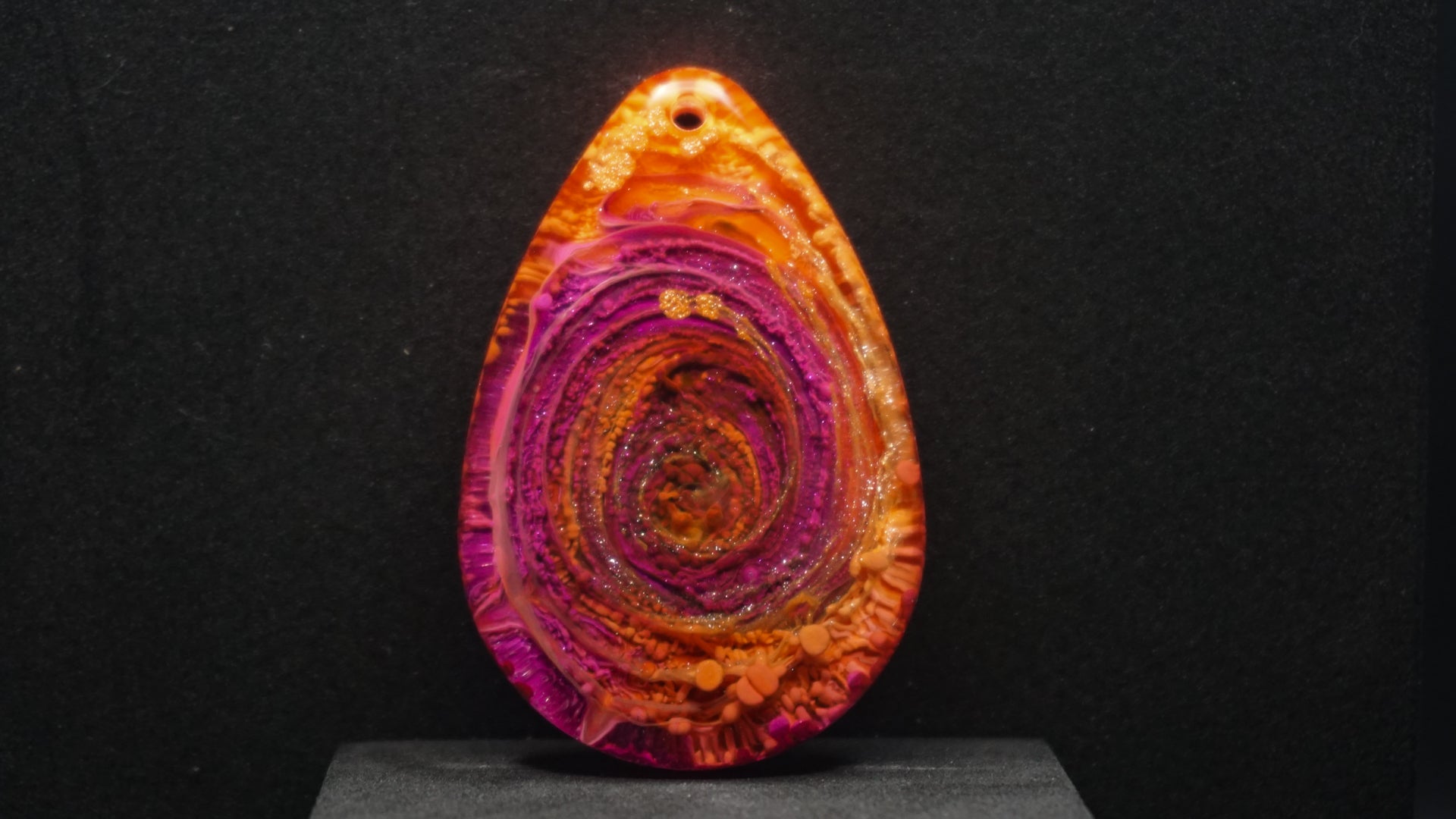 All of our pieces are resin based, featuring a variety of shimmery/sparkly mica backdrops, alcohol ink, and hand painted designs. At this time we are only including personalization on the back of the tag to not compete with the design. Most alcohol ink tags are backed in either black or white depending on what we feel works the best.