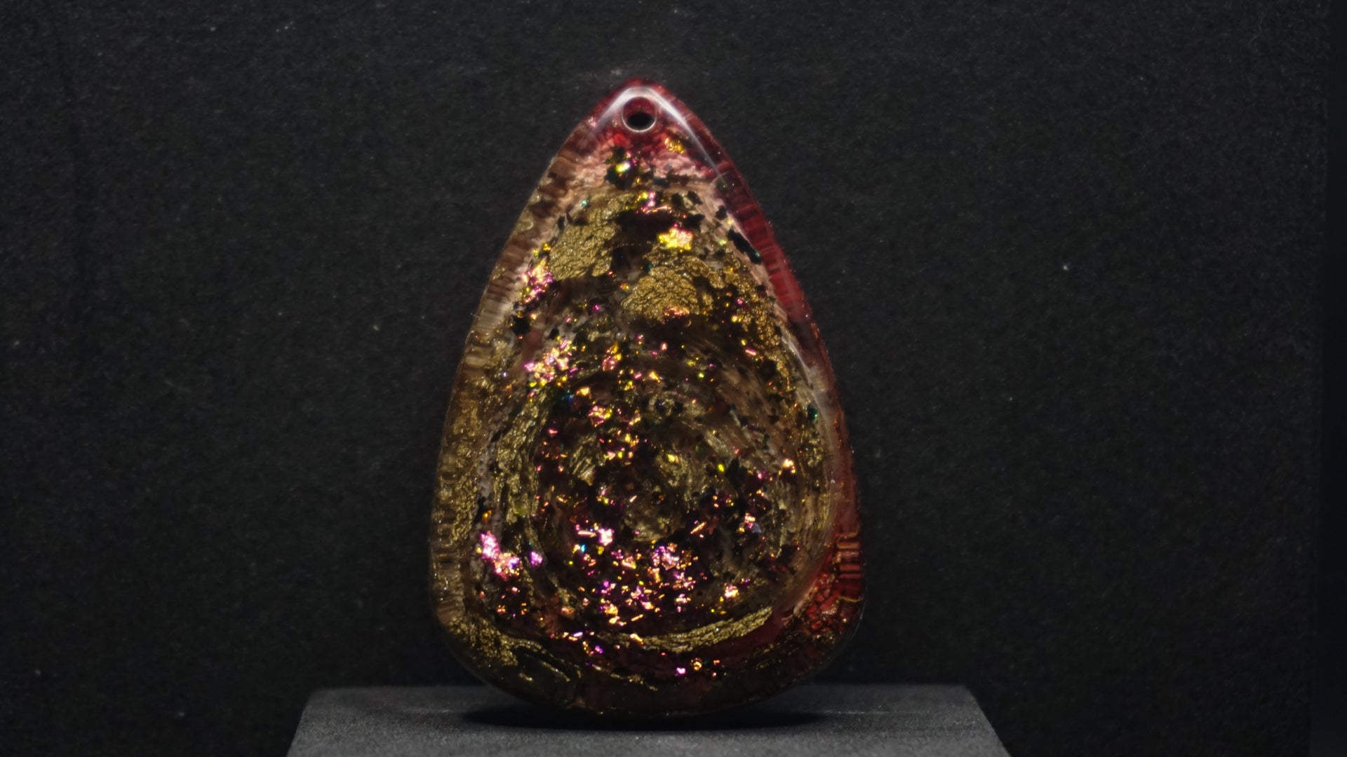 All of our pieces are resin based, featuring a variety of shimmery/sparkly mica backdrops, alcohol ink, and hand painted designs. At this time we are only including personalization on the back of the tag to not compete with the design. Most alcohol ink tags are backed in either black or white depending on what we feel works the best.