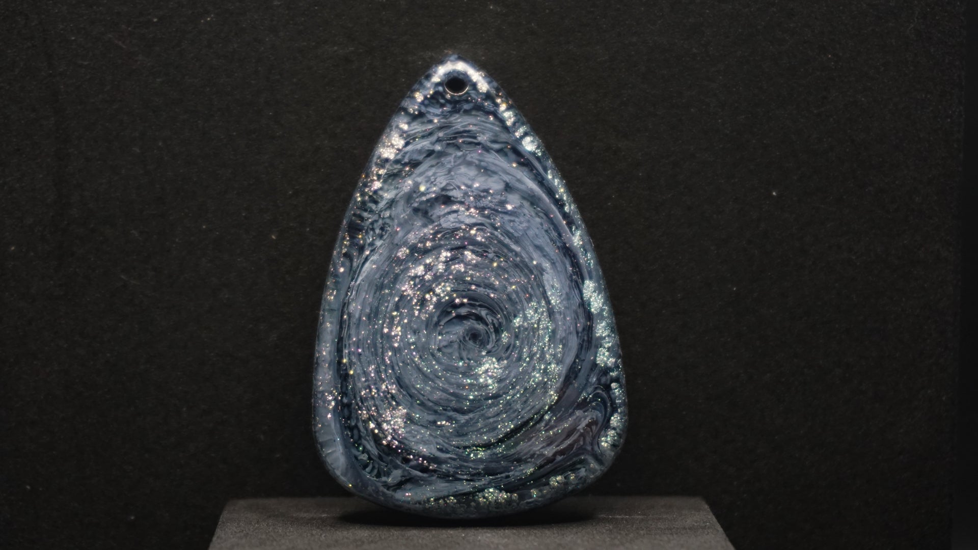 All of our pieces are resin based, featuring a variety of shimmery/sparkly mica backdrops, alcohol ink, and hand painted designs. At this time we are only including personalization on the back of the tag to not compete with the design. Most alcohol ink tags are backed in either black or white depending on what we feel works the best.