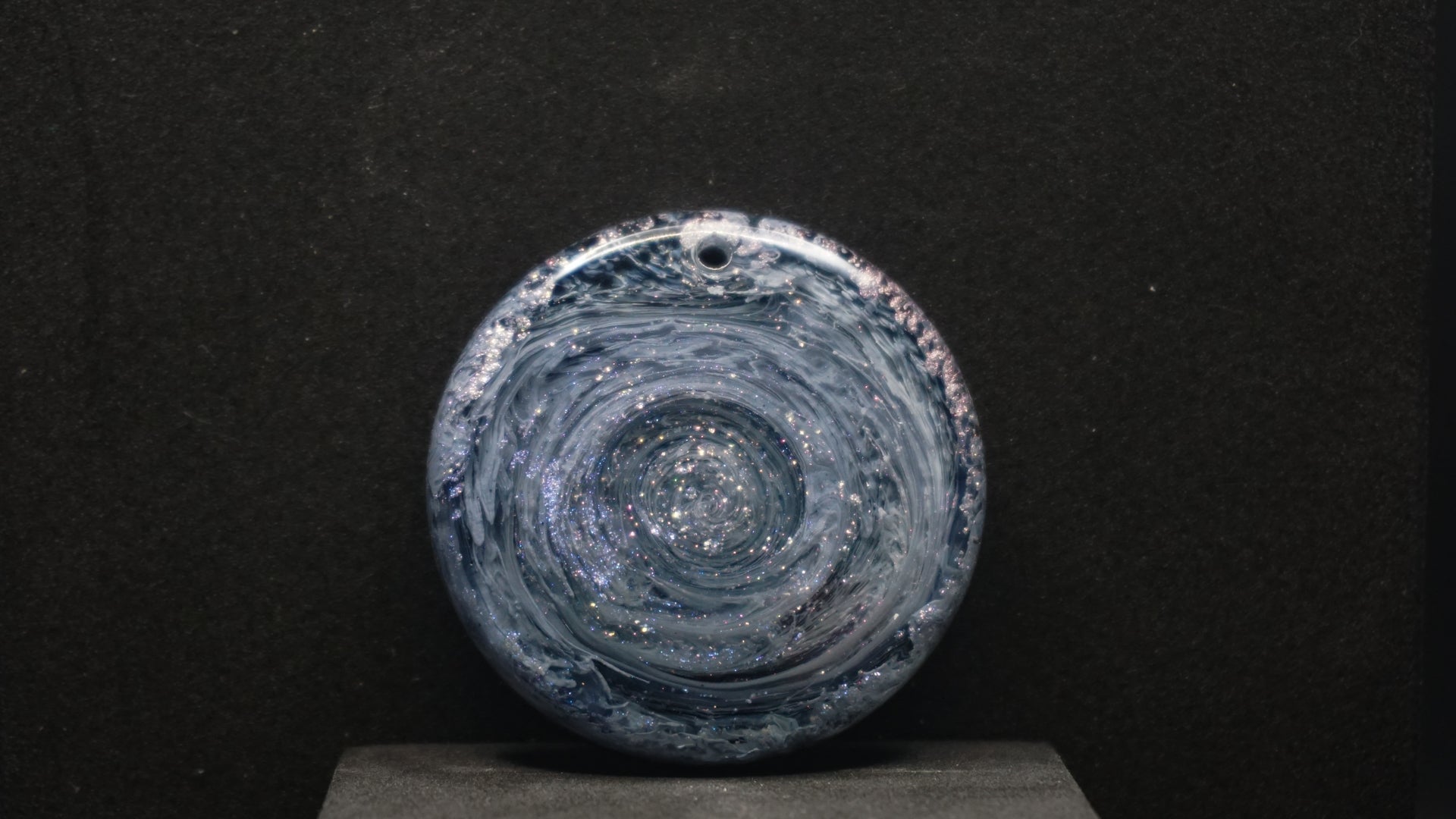 All of our pieces are resin based, featuring a variety of shimmery/sparkly mica backdrops, alcohol ink, and hand painted designs. At this time we are only including personalization on the back of the tag to not compete with the design. Most alcohol ink tags are backed in either black or white depending on what we feel works the best.
