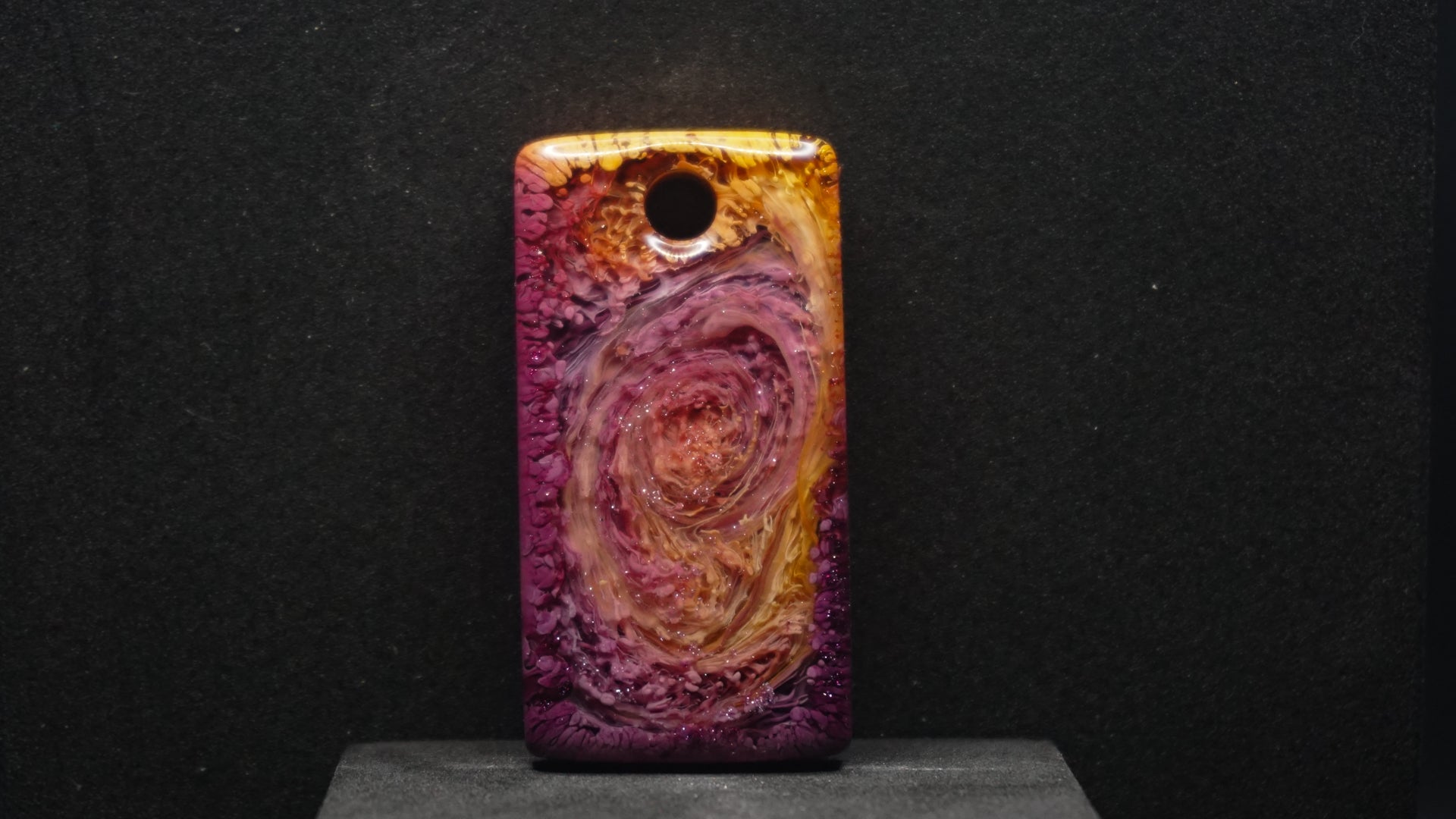 All of our pieces are resin based, featuring a variety of shimmery/sparkly mica backdrops, alcohol ink, and hand painted designs. At this time we are only including personalization on the back of the tag to not compete with the design. Most alcohol ink tags are backed in either black or white depending on what we feel works the best.