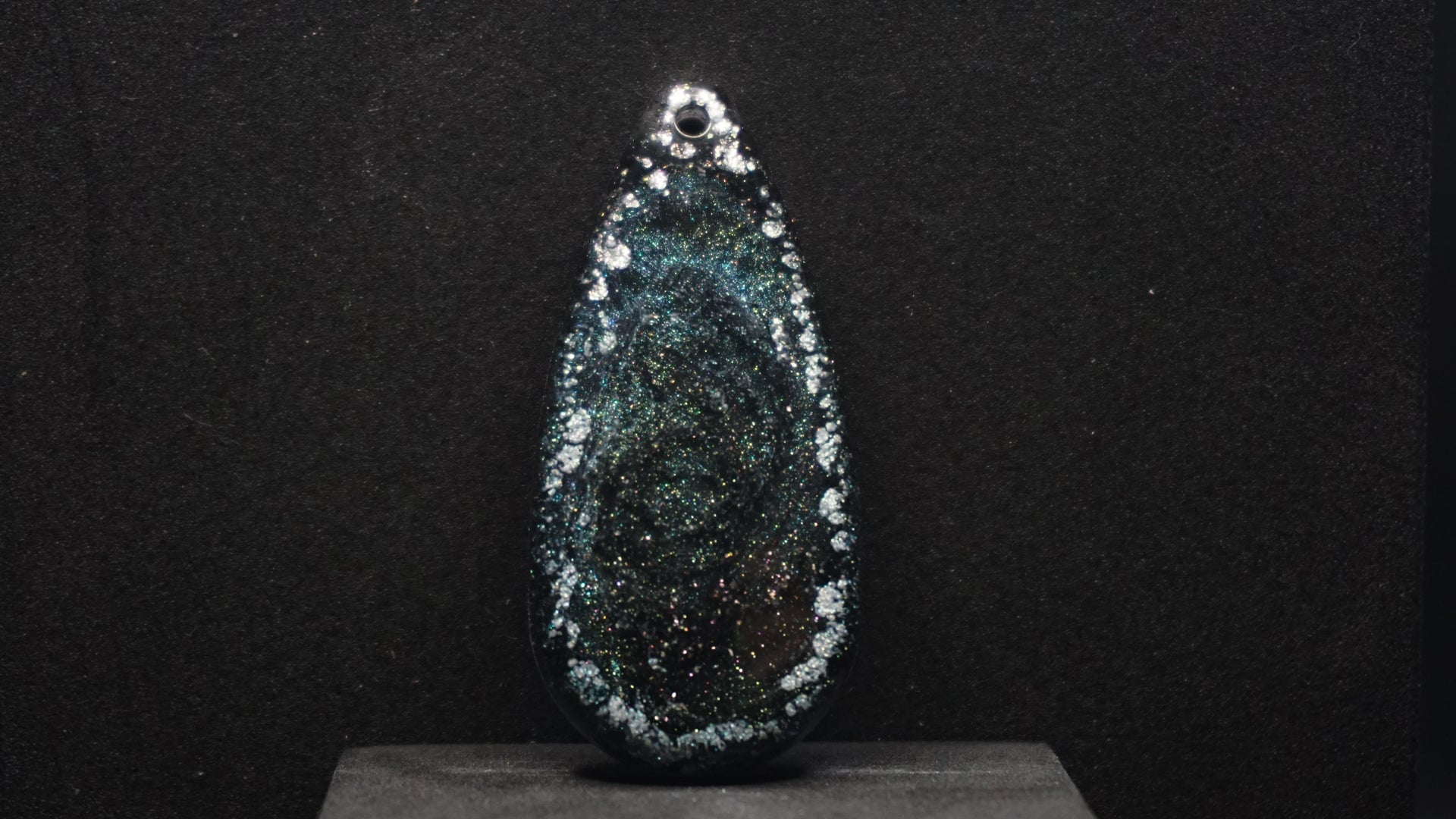All of our pieces are resin based, featuring a variety of shimmery/sparkly mica backdrops, alcohol ink, and hand painted designs. At this time we are only including personalization on the back of the tag to not compete with the design. Most alcohol ink tags are backed in either black or white depending on what we feel works the best.