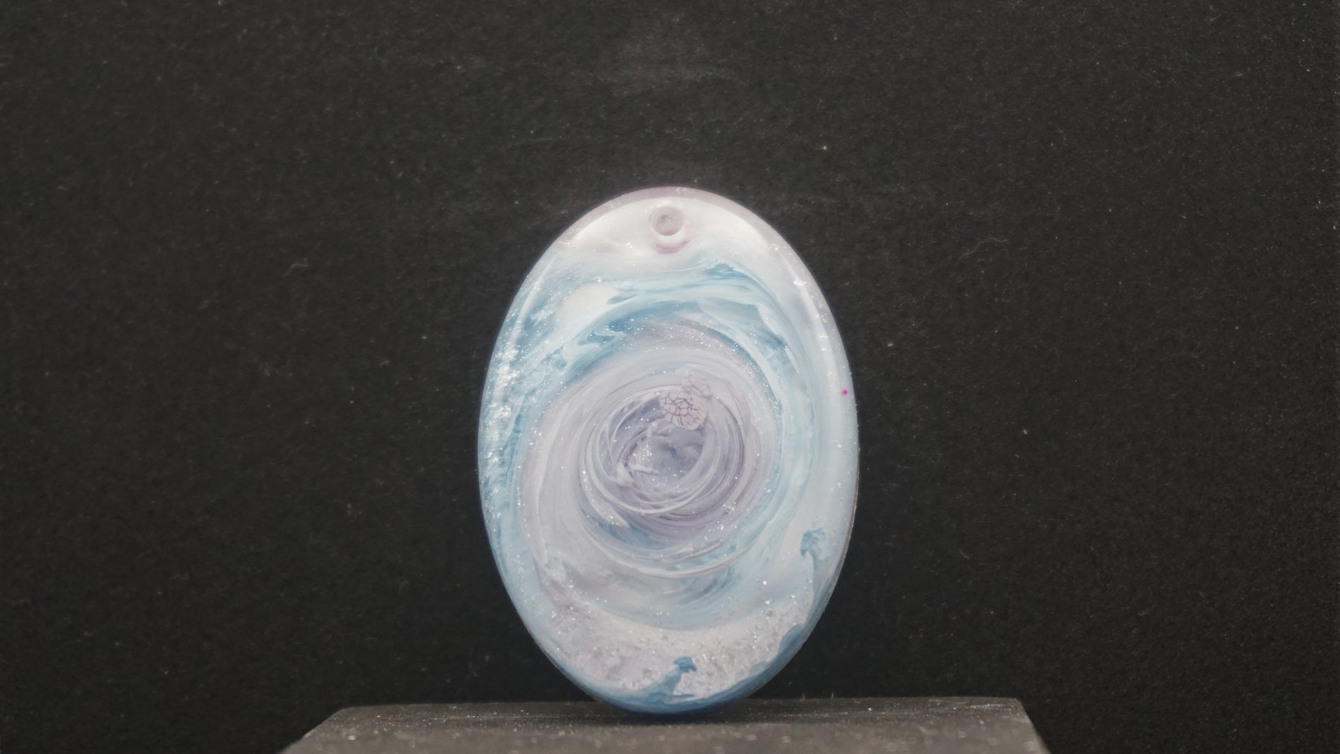 All of our pieces are resin based, featuring a variety of shimmery/sparkly mica backdrops, alcohol ink, and hand painted designs. At this time we are only including personalization on the back of the tag to not compete with the design. Most alcohol ink tags are backed in either black or white depending on what we feel works the best.