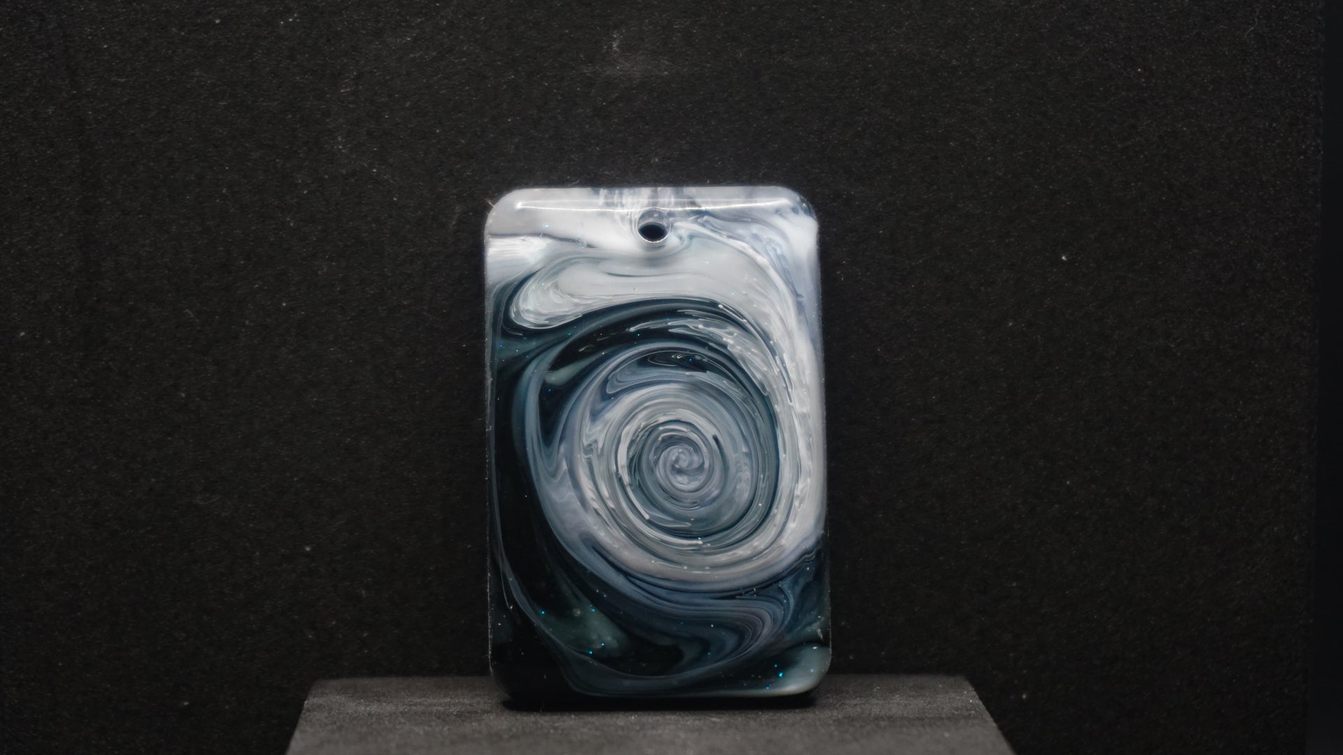 All of our pieces are resin based, featuring a variety of shimmery/sparkly mica backdrops, alcohol ink, and hand painted designs. At this time we are only including personalization on the back of the tag to not compete with the design. Most alcohol ink tags are backed in either black or white depending on what we feel works the best.