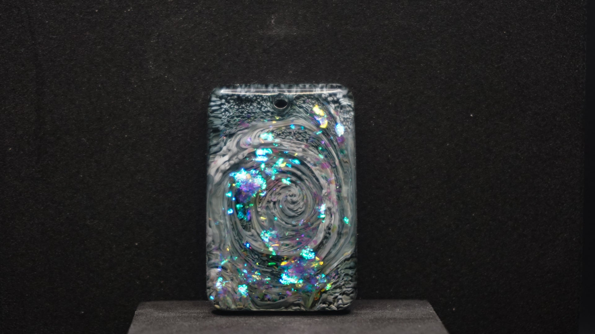 All of our pieces are resin based, featuring a variety of shimmery/sparkly mica backdrops, alcohol ink, and hand painted designs. At this time we are only including personalization on the back of the tag to not compete with the design. Most alcohol ink tags are backed in either black or white depending on what we feel works the best.