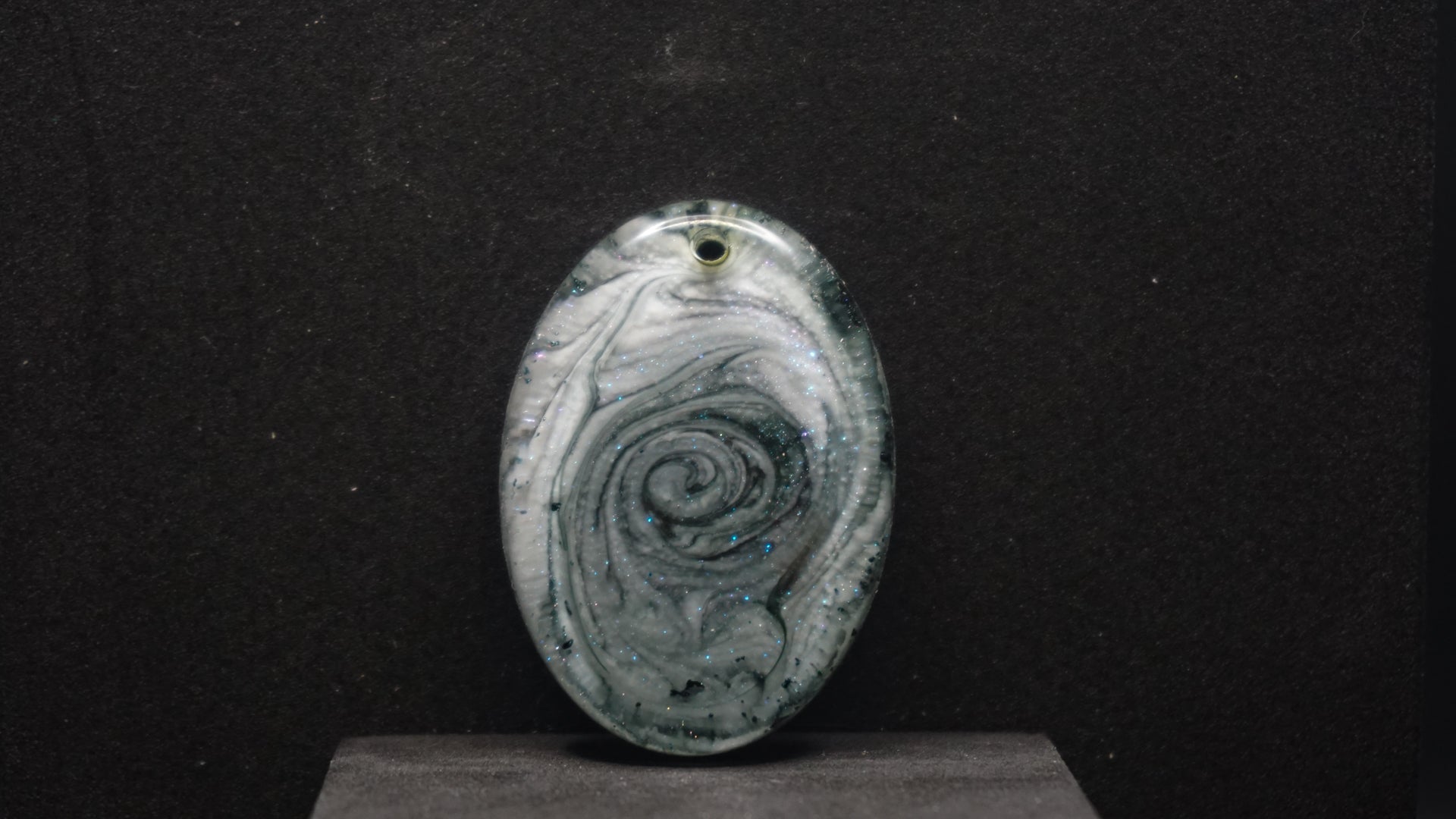 All of our pieces are resin based, featuring a variety of shimmery/sparkly mica backdrops, alcohol ink, and hand painted designs. At this time we are only including personalization on the back of the tag to not compete with the design. Most alcohol ink tags are backed in either black or white depending on what we feel works the best.