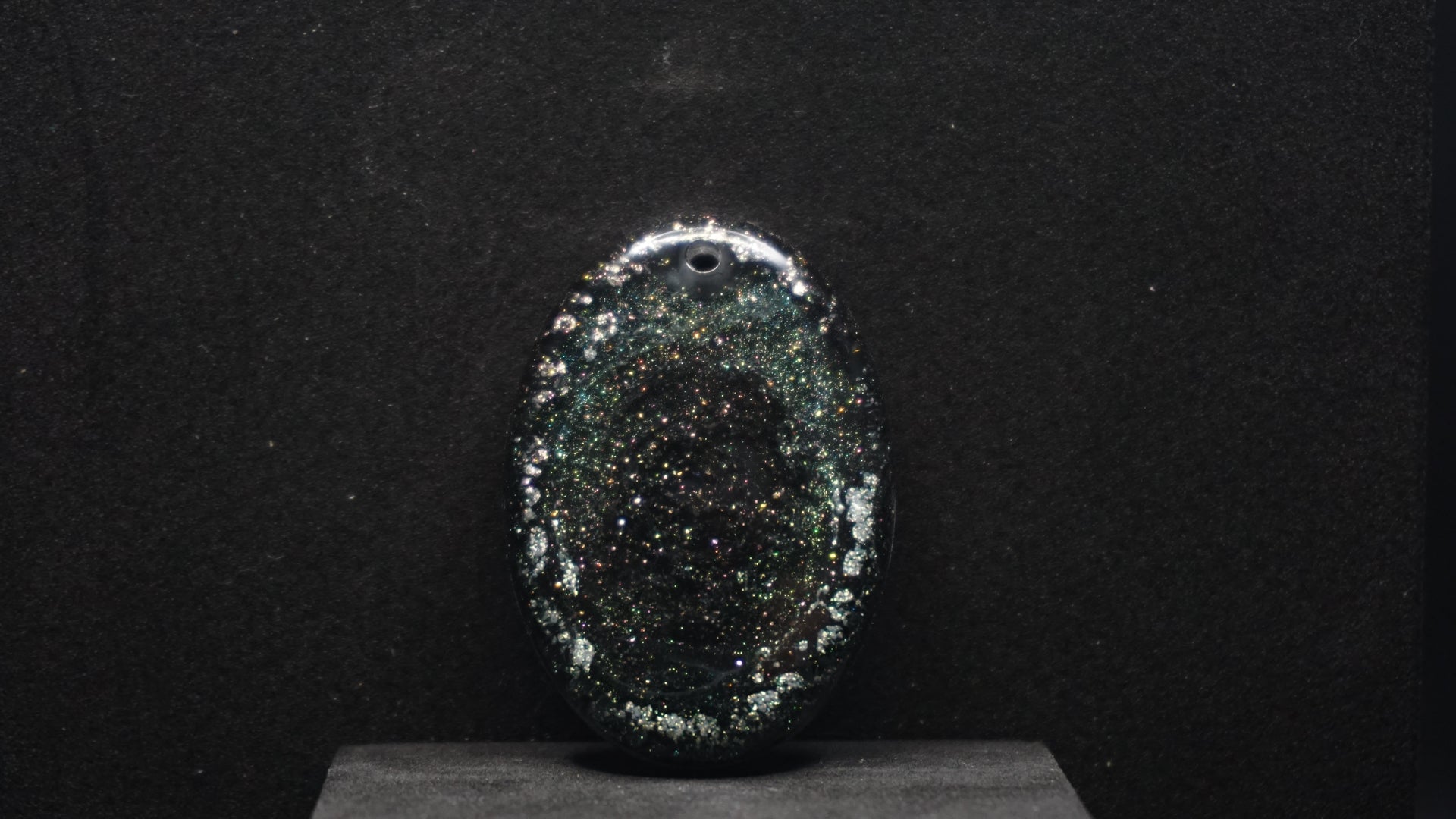 All of our pieces are resin based, featuring a variety of shimmery/sparkly mica backdrops, alcohol ink, and hand painted designs. At this time we are only including personalization on the back of the tag to not compete with the design. Most alcohol ink tags are backed in either black or white depending on what we feel works the best.