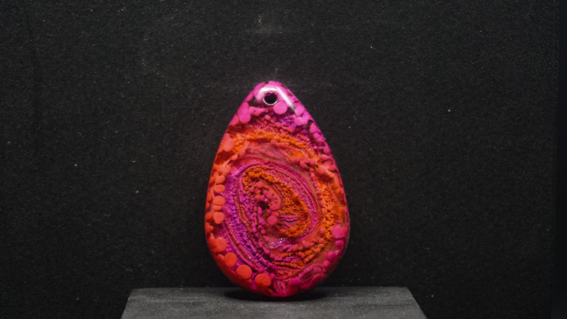 All of our pieces are resin based, featuring a variety of shimmery/sparkly mica backdrops, alcohol ink, and hand painted designs. At this time we are only including personalization on the back of the tag to not compete with the design. Most alcohol ink tags are backed in either black or white depending on what we feel works the best.