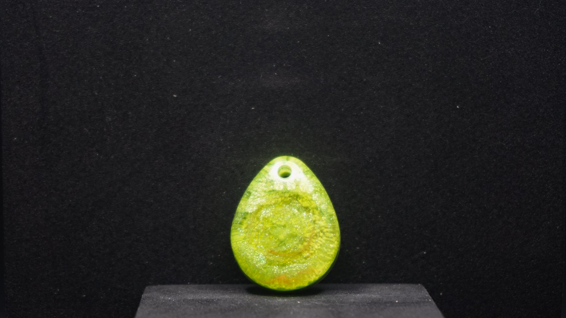 All of our pieces are resin based, featuring a variety of shimmery/sparkly mica backdrops, alcohol ink, and hand painted designs. At this time we are only including personalization on the back of the tag to not compete with the design. Most alcohol ink tags are backed in either black or white depending on what we feel works the best.