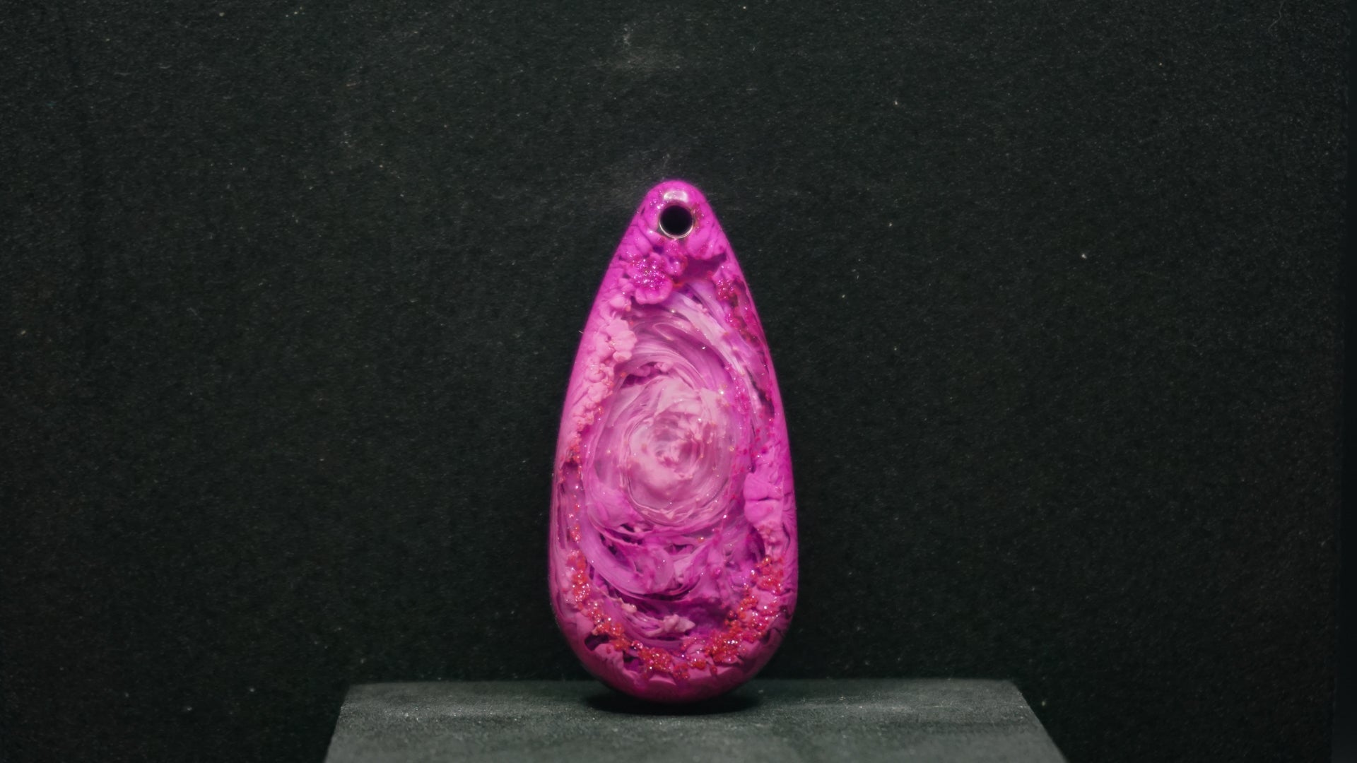 All of our pieces are resin based, featuring a variety of shimmery/sparkly mica backdrops, alcohol ink, and hand painted designs. At this time we are only including personalization on the back of the tag to not compete with the design. Most alcohol ink tags are backed in either black or white depending on what we feel works the best.