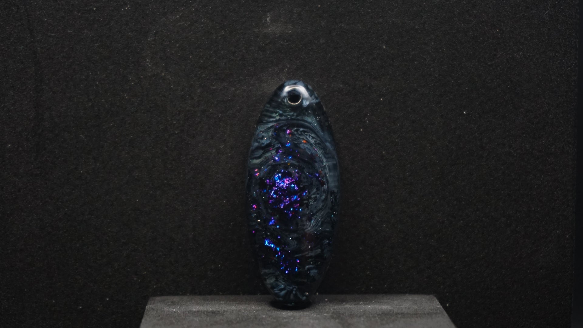 All of our pieces are resin based, featuring a variety of shimmery/sparkly mica backdrops, alcohol ink, and hand painted designs. At this time we are only including personalization on the back of the tag to not compete with the design. Most alcohol ink tags are backed in either black or white depending on what we feel works the best.