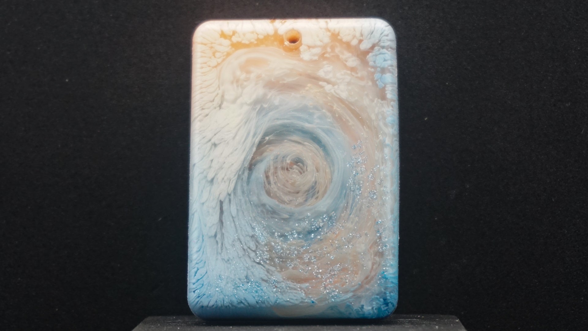 All of our pieces are resin based, featuring a variety of shimmery/sparkly mica backdrops, alcohol ink, and hand painted designs. At this time we are only including personalization on the back of the tag to not compete with the design. Most alcohol ink tags are backed in either black or white depending on what we feel works the best.