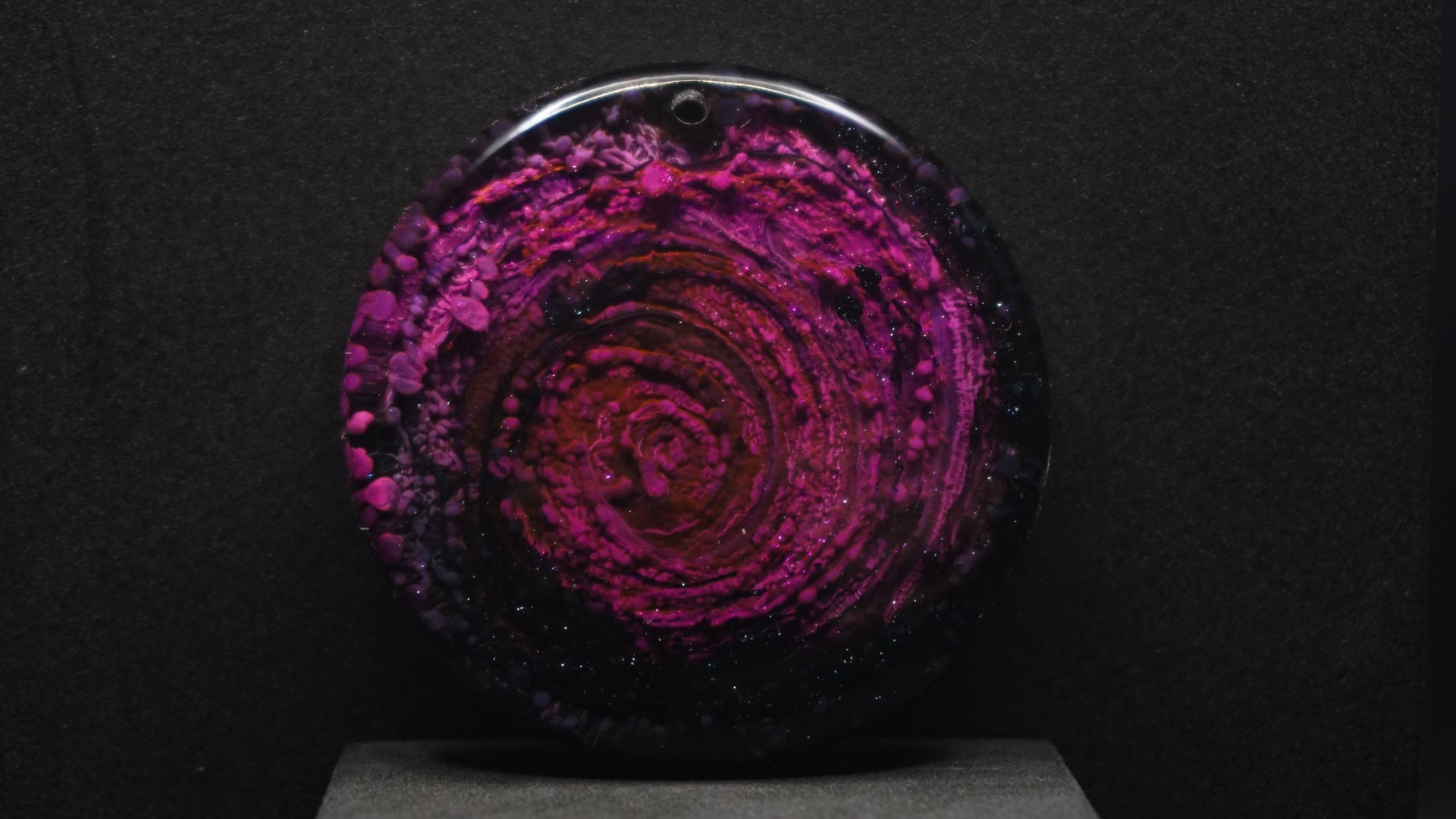 All of our pieces are resin based, featuring a variety of shimmery/sparkly mica backdrops, alcohol ink, and hand painted designs. At this time we are only including personalization on the back of the tag to not compete with the design. Most alcohol ink tags are backed in either black or white depending on what we feel works the best.