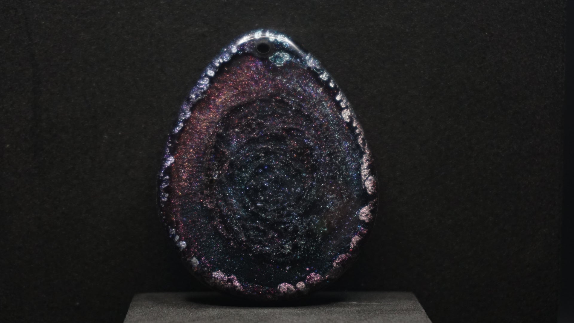 All of our pieces are resin based, featuring a variety of shimmery/sparkly mica backdrops, alcohol ink, and hand painted designs. At this time we are only including personalization on the back of the tag to not compete with the design. Most alcohol ink tags are backed in either black or white depending on what we feel works the best.