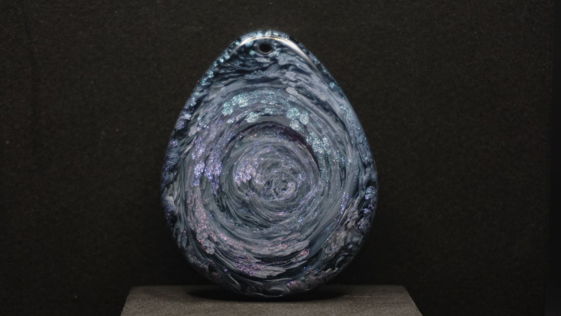 All of our pieces are resin based, featuring a variety of shimmery/sparkly mica backdrops, alcohol ink, and hand painted designs. At this time we are only including personalization on the back of the tag to not compete with the design. Most alcohol ink tags are backed in either black or white depending on what we feel works the best.