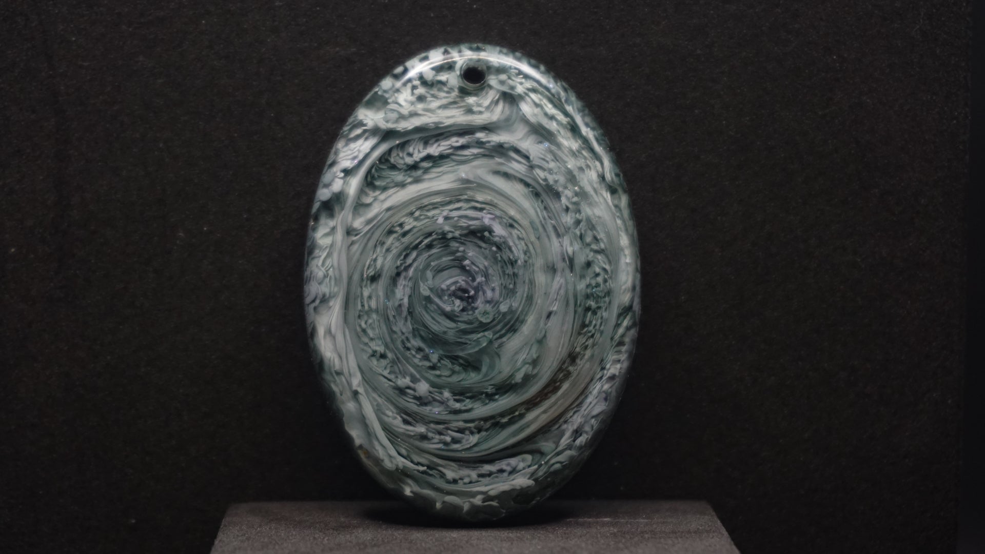 All of our pieces are resin based, featuring a variety of shimmery/sparkly mica backdrops, alcohol ink, and hand painted designs. At this time we are only including personalization on the back of the tag to not compete with the design. Most alcohol ink tags are backed in either black or white depending on what we feel works the best.
