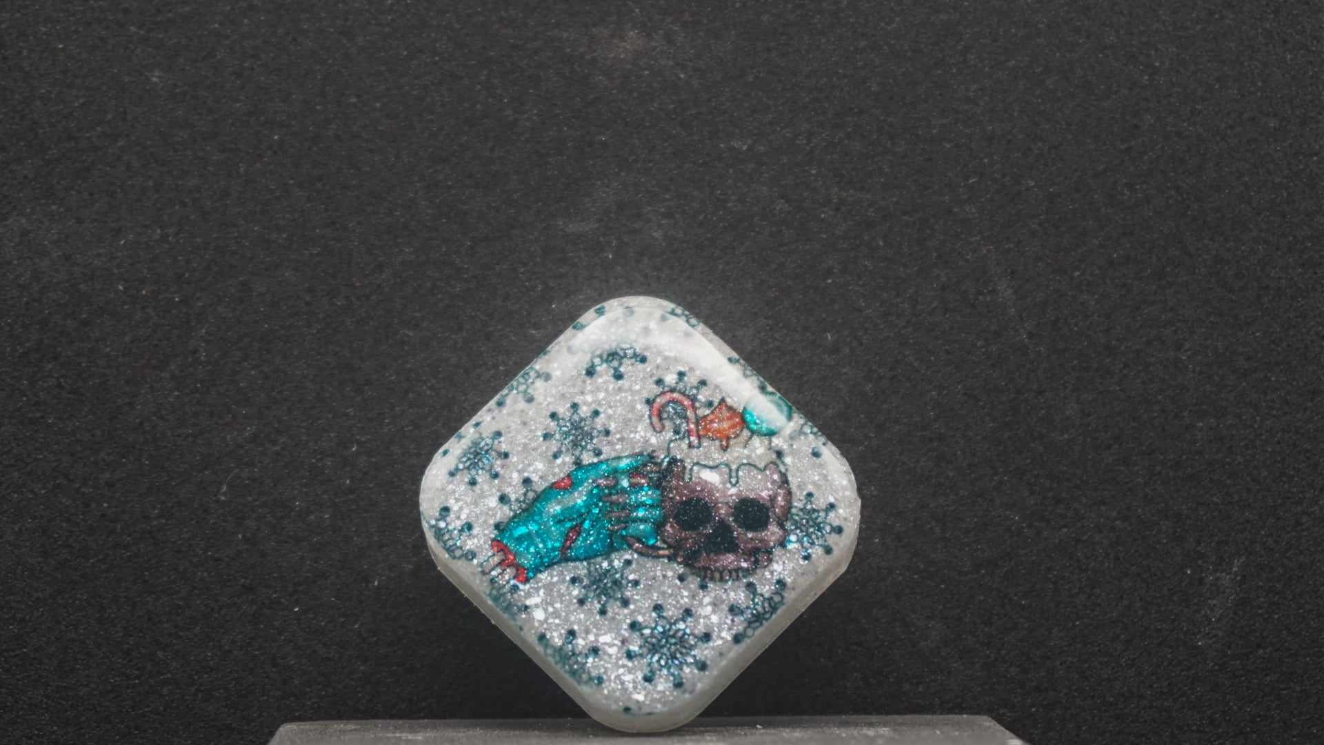 All of our pieces are resin based, featuring a variety of shimmery/sparkly mica backdrops, alcohol ink, and hand painted designs. At this time we are only including personalization on the back of the tag to not compete with the design. Most alcohol ink tags are backed in either black or white depending on what we feel works the best.