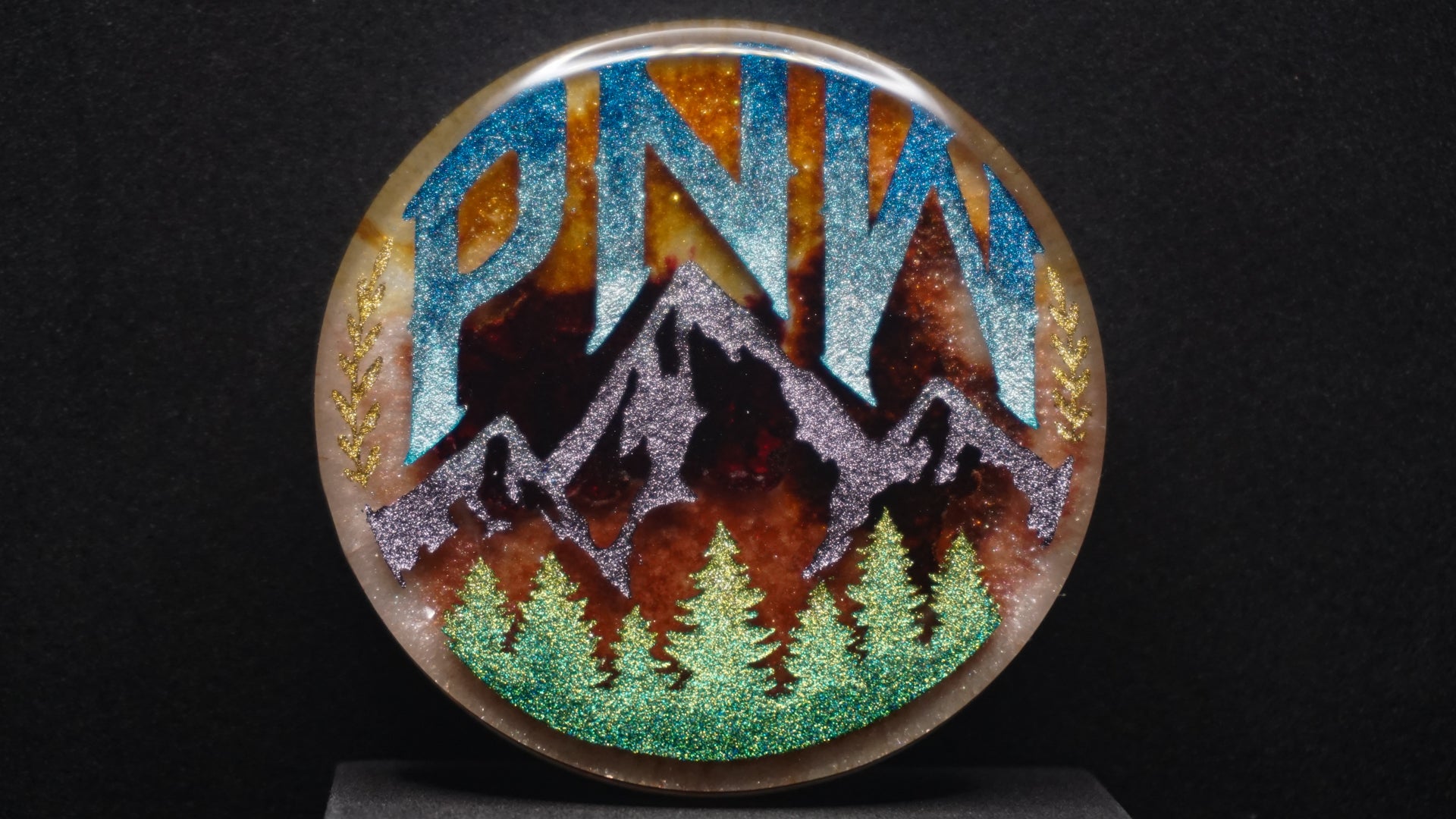 All of our pieces are resin based, featuring a variety of shimmery/sparkly mica backdrops, alcohol ink, and hand painted designs. At this time we are only including personalization on the back of the tag to not compete with the design. Most alcohol ink tags are backed in either black or white depending on what we feel works the best.
