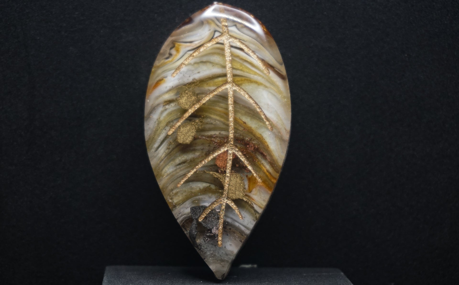 All of our pieces are resin based, featuring a variety of shimmery/sparkly mica backdrops, alcohol ink, and hand painted designs. At this time we are only including personalization on the back of the tag to not compete with the design. Most alcohol ink tags are backed in either black or white depending on what we feel works the best.