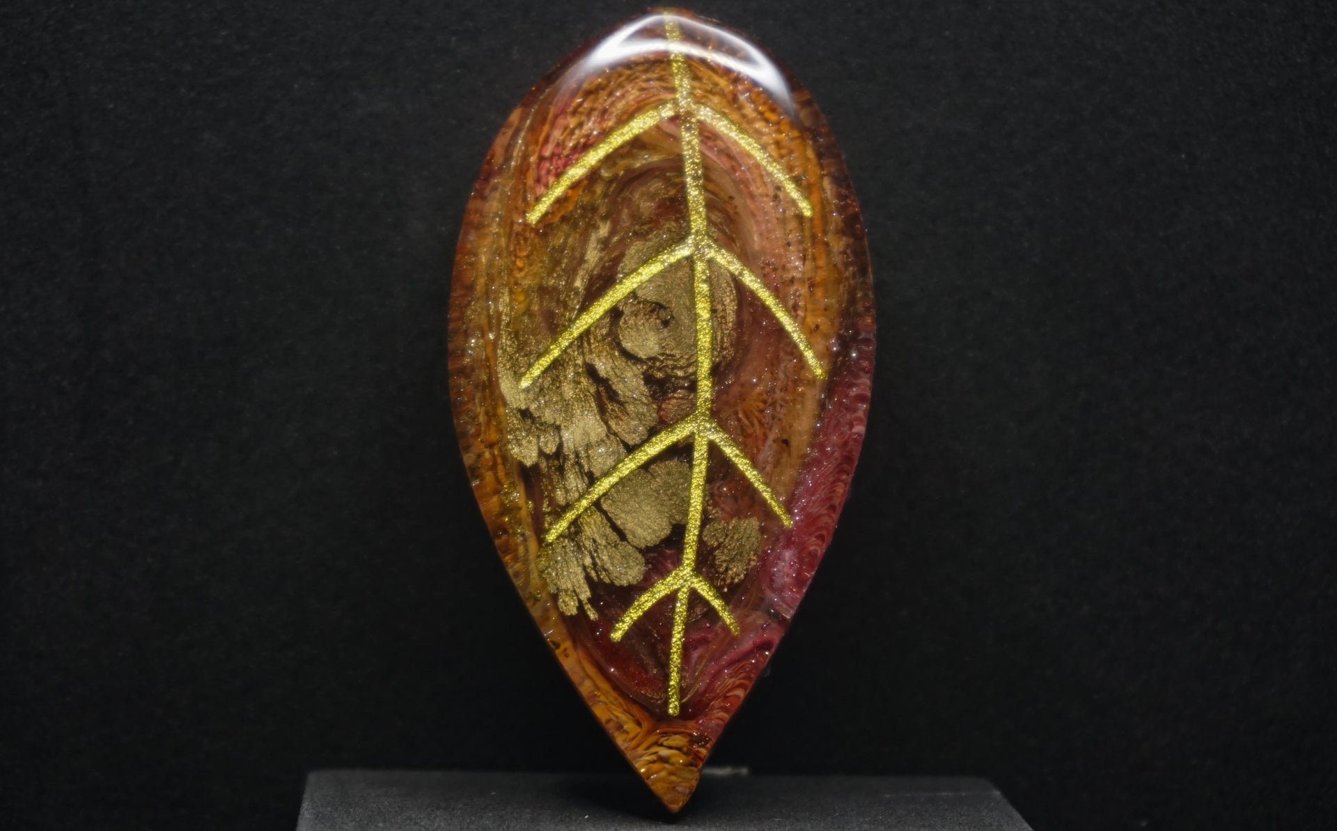 All of our pieces are resin based, featuring a variety of shimmery/sparkly mica backdrops, alcohol ink, and hand painted designs. At this time we are only including personalization on the back of the tag to not compete with the design. Most alcohol ink tags are backed in either black or white depending on what we feel works the best.