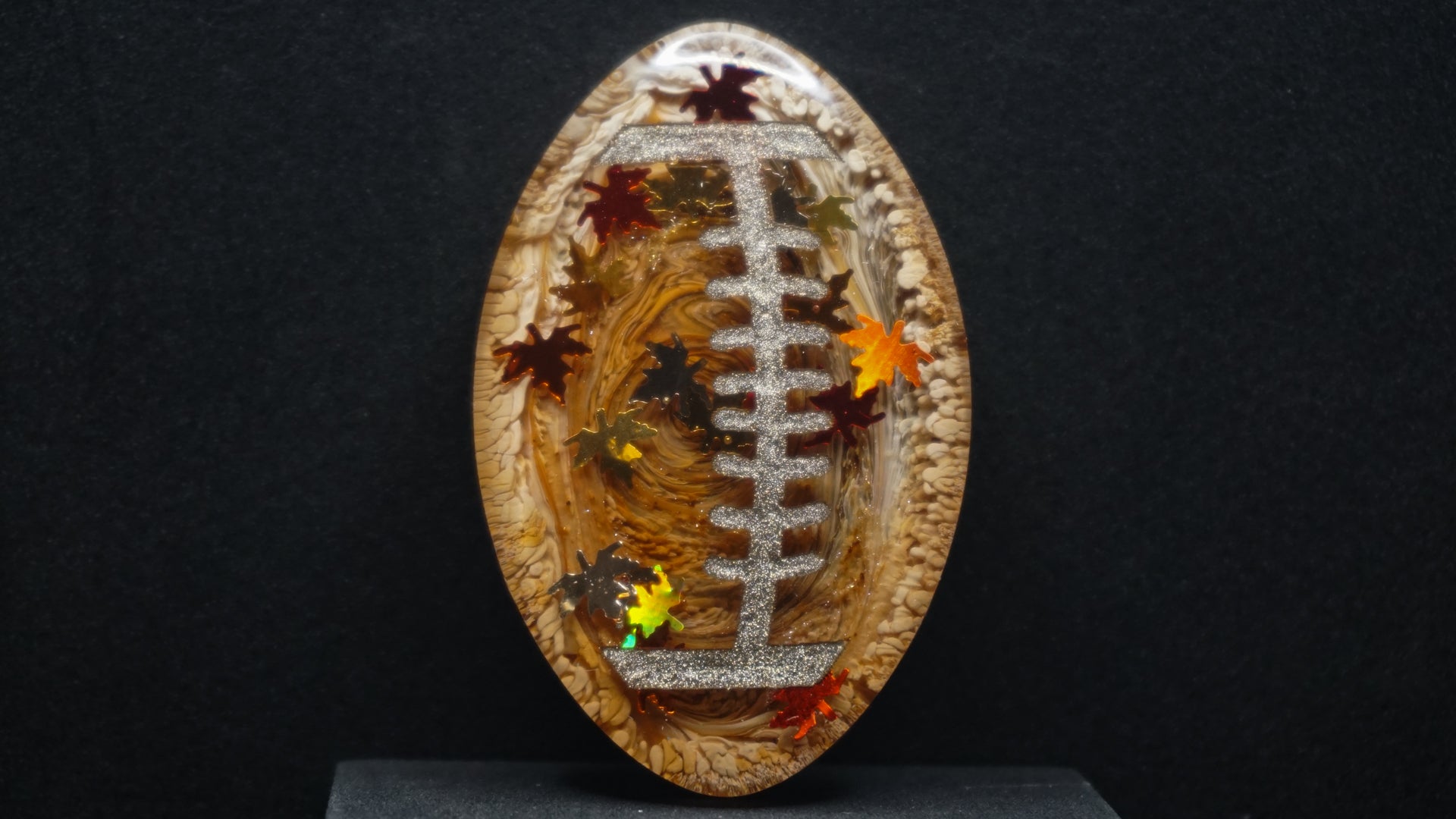 All of our pieces are resin based, featuring a variety of shimmery/sparkly mica backdrops, alcohol ink, and hand painted designs. At this time we are only including personalization on the back of the tag to not compete with the design. Most alcohol ink tags are backed in either black or white depending on what we feel works the best.