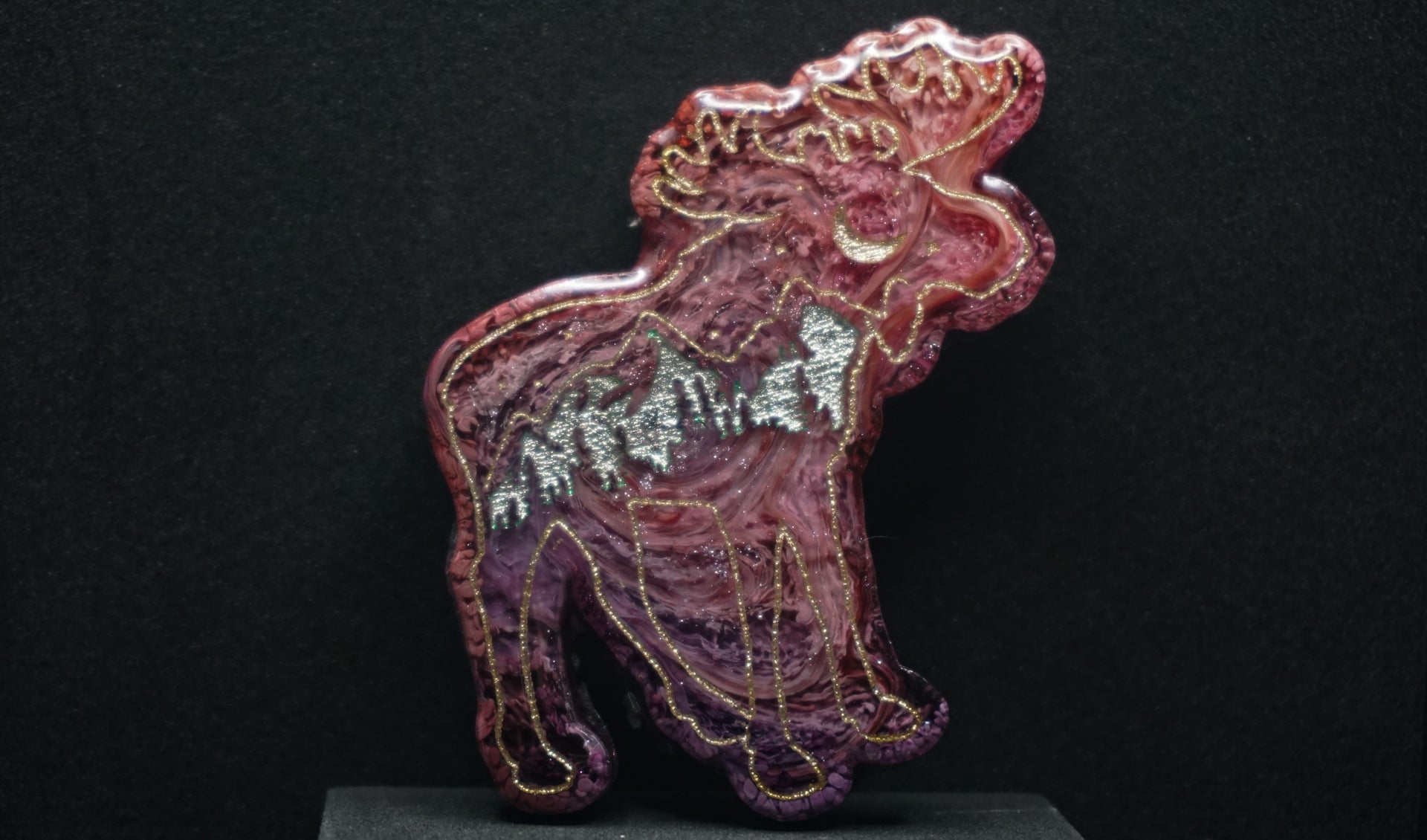 All of our pieces are resin based, featuring a variety of shimmery/sparkly mica backdrops, alcohol ink, and hand painted designs. At this time we are only including personalization on the back of the tag to not compete with the design. Most alcohol ink tags are backed in either black or white depending on what we feel works the best.