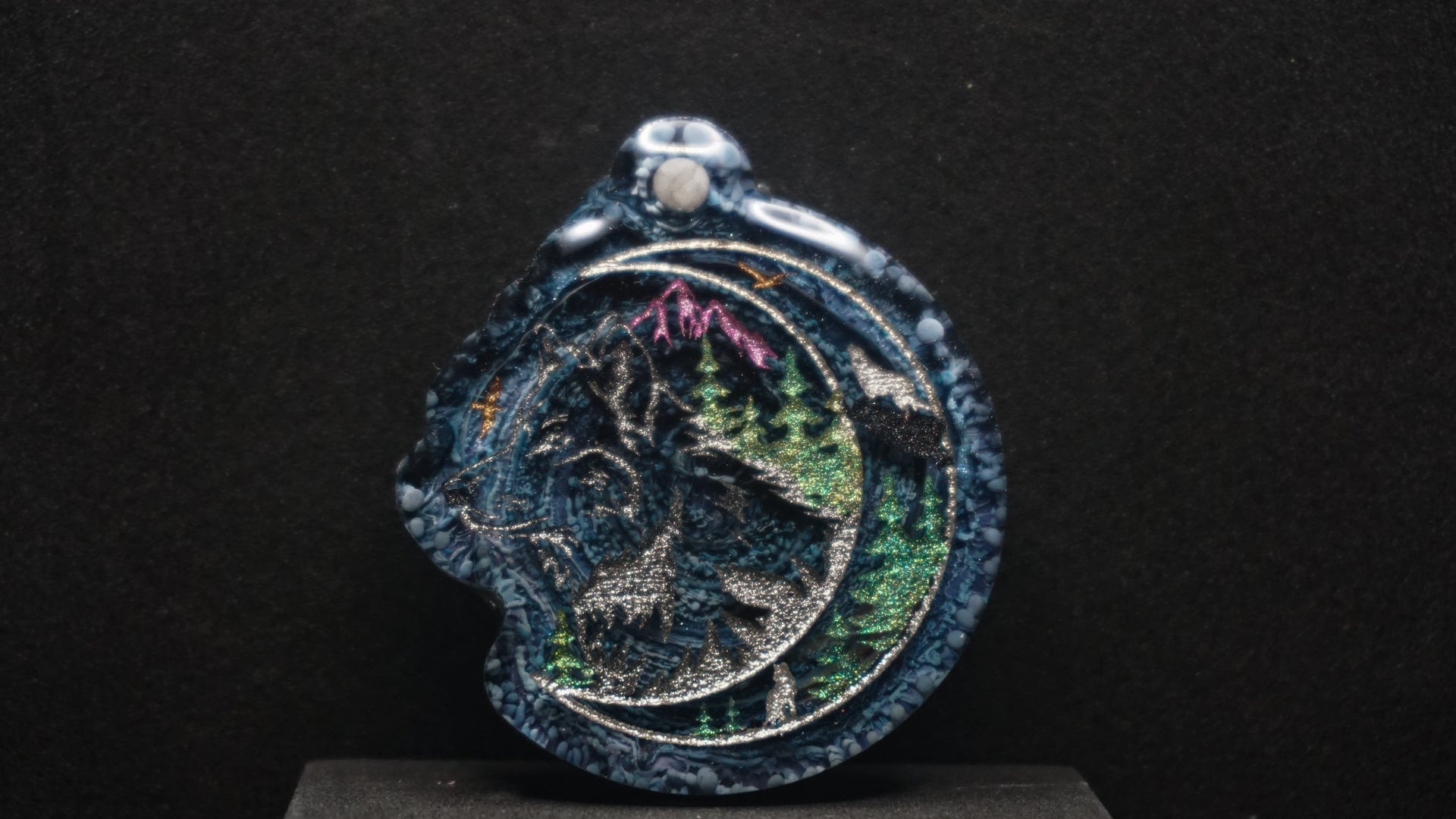 All of our pieces are resin based, featuring a variety of shimmery/sparkly mica backdrops, alcohol ink, and hand painted designs. At this time we are only including personalization on the back of the tag to not compete with the design. Most alcohol ink tags are backed in either black or white depending on what we feel works the best.