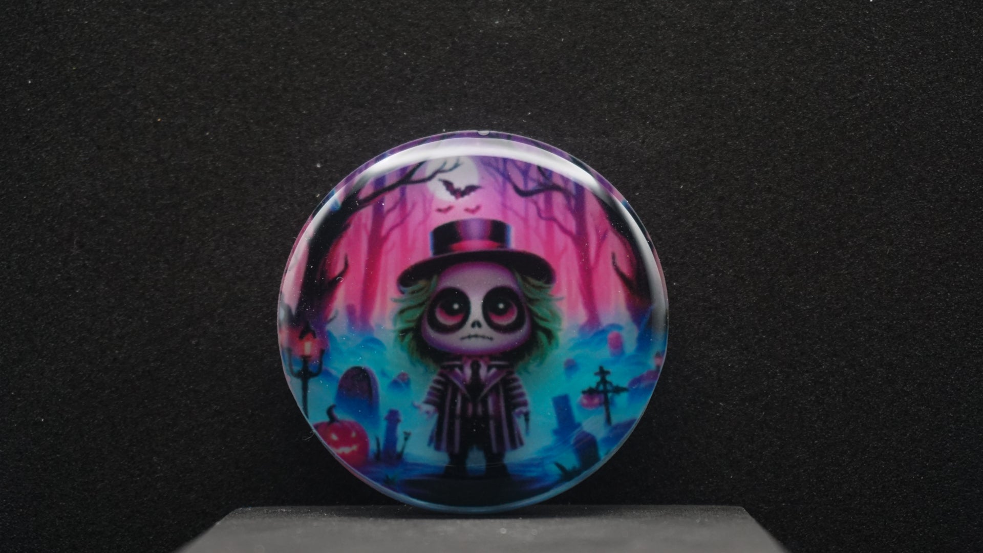 All of our pieces are resin based, featuring a variety of shimmery/sparkly mica backdrops, alcohol ink, and hand painted designs. At this time we are only including personalization on the back of the tag to not compete with the design. Most alcohol ink tags are backed in either black or white depending on what we feel works the best.
