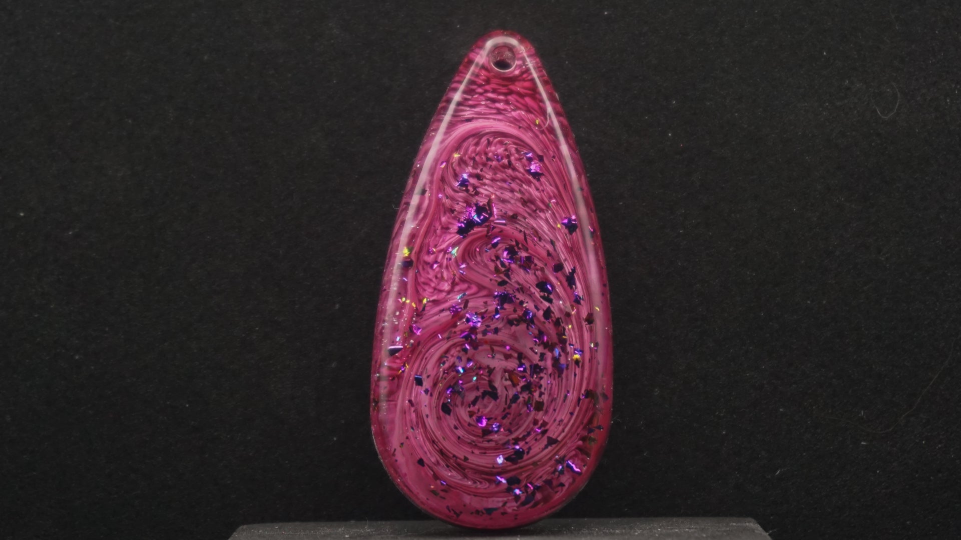 All of our pieces are resin based, featuring a variety of shimmery/sparkly mica backdrops, alcohol ink, and hand painted designs. At this time we are only including personalization on the back of the tag to not compete with the design. Most alcohol ink tags are backed in either black or white depending on what we feel works the best.