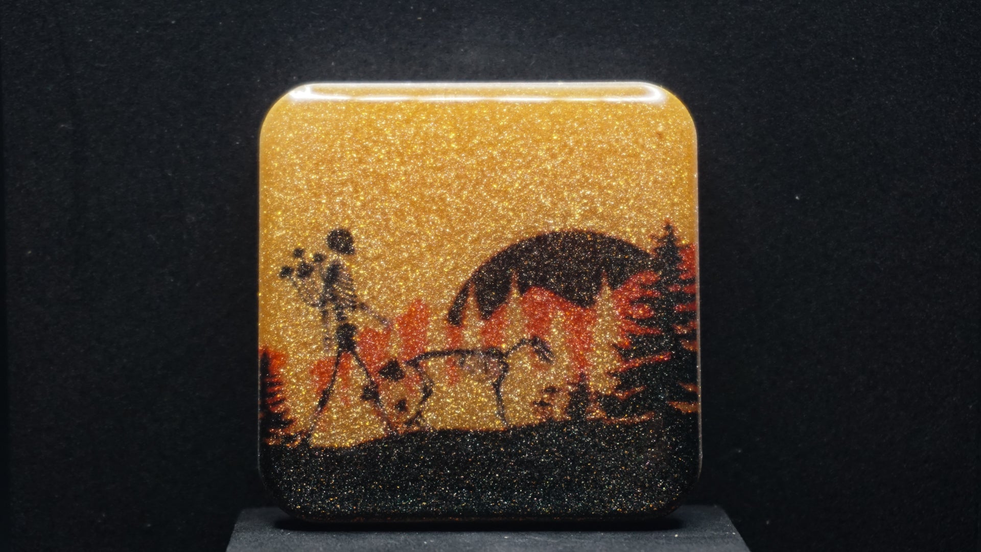 All of our pieces are resin based, featuring a variety of shimmery/sparkly mica backdrops, alcohol ink, and hand painted designs. At this time we are only including personalization on the back of the tag to not compete with the design. Most alcohol ink tags are backed in either black or white depending on what we feel works the best.