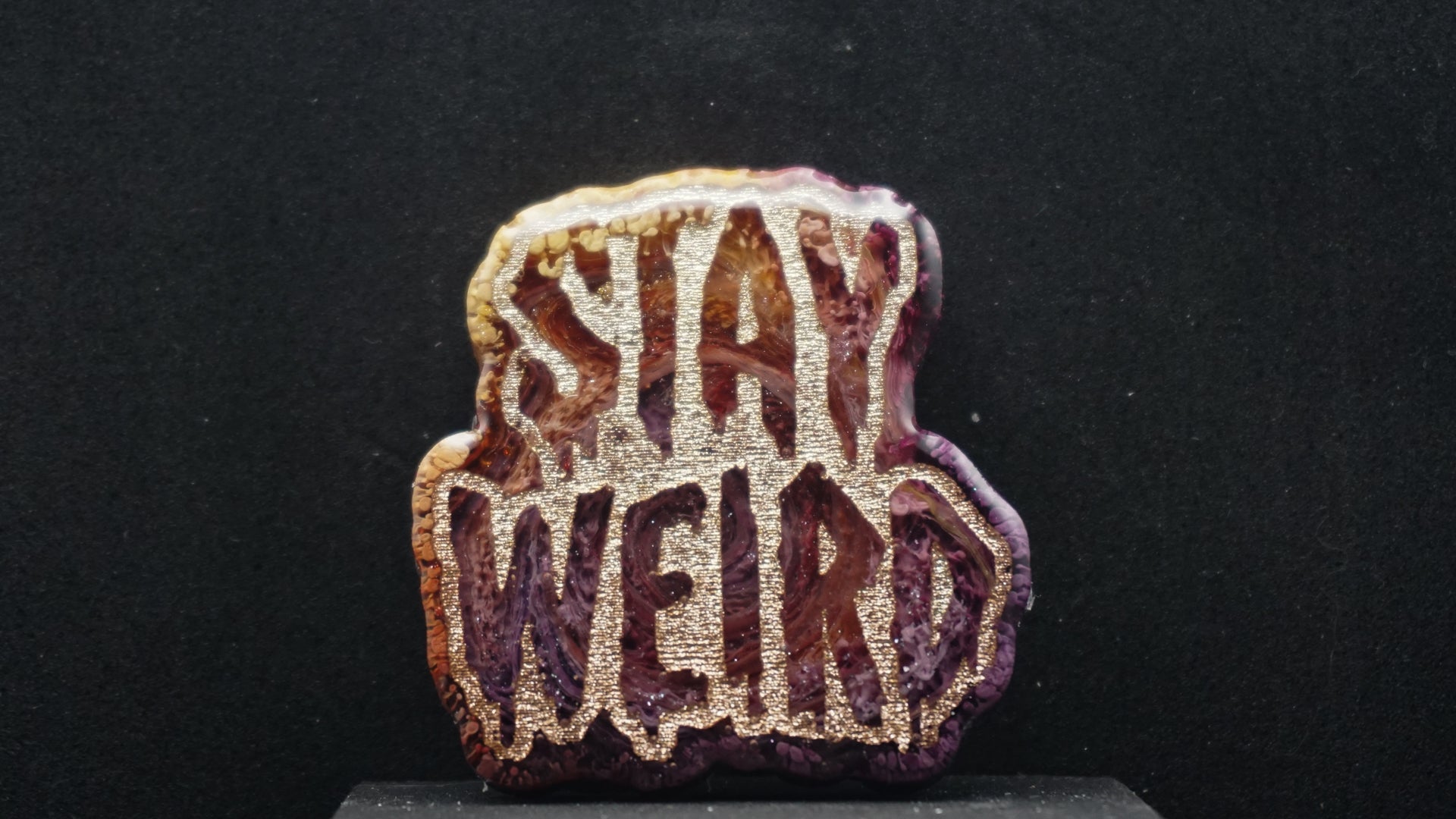 All of our pieces are resin based, featuring a variety of shimmery/sparkly mica backdrops, alcohol ink, and hand painted designs. At this time we are only including personalization on the back of the tag to not compete with the design. Most alcohol ink tags are backed in either black or white depending on what we feel works the best.