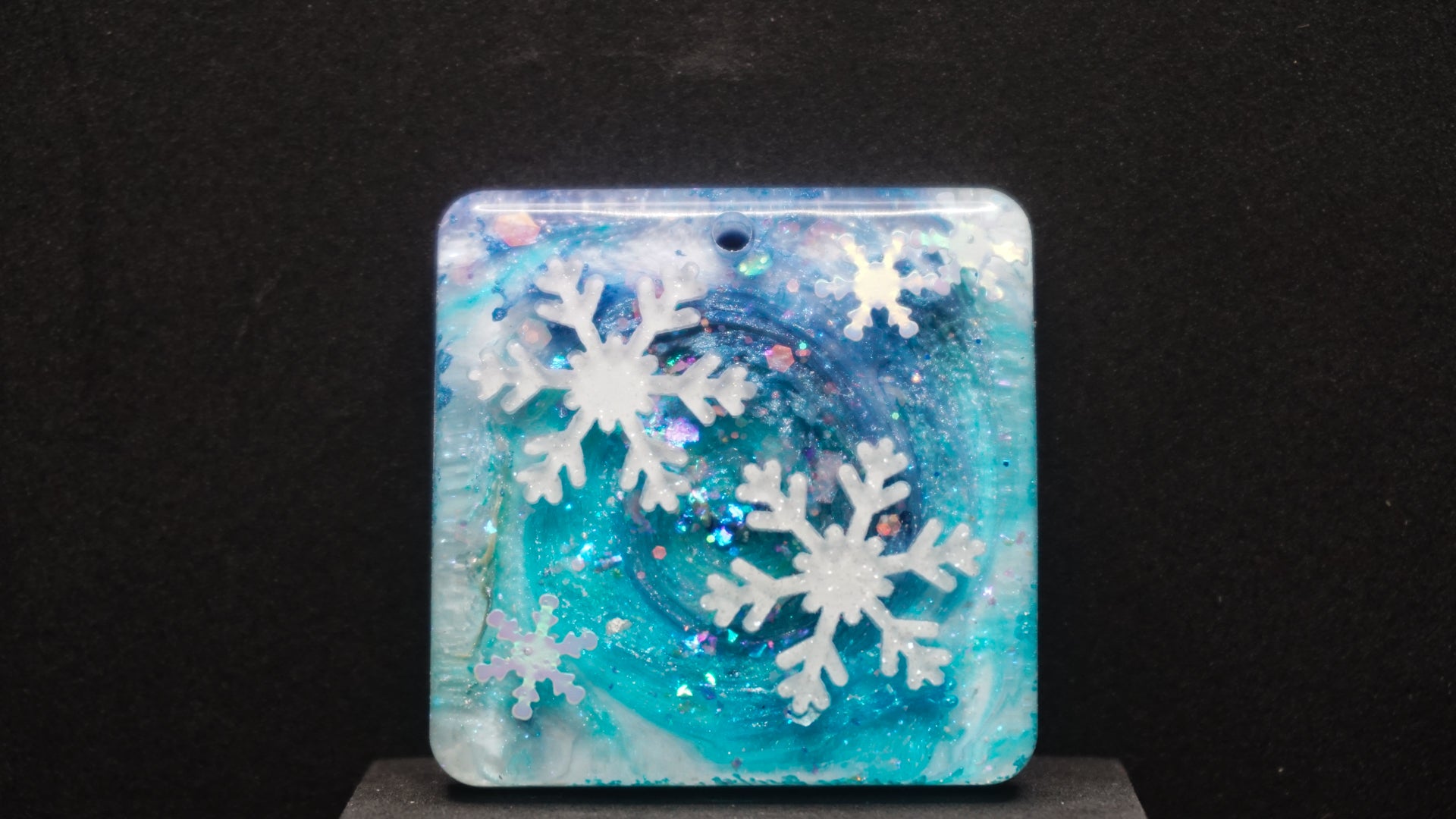 All of our pieces are resin based, featuring a variety of shimmery/sparkly mica backdrops, alcohol ink, and hand painted designs. At this time we are only including personalization on the back of the tag to not compete with the design. Most alcohol ink tags are backed in either black or white depending on what we feel works the best.