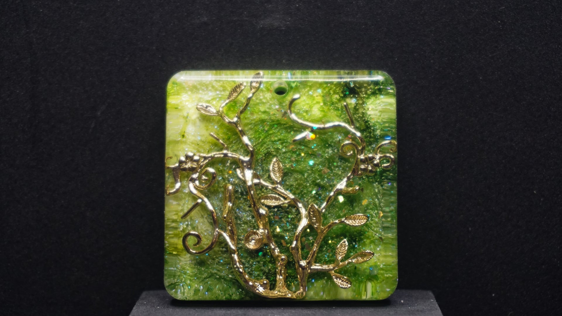 All of our pieces are resin based, featuring a variety of shimmery/sparkly mica backdrops, alcohol ink, and hand painted designs. At this time we are only including personalization on the back of the tag to not compete with the design. Most alcohol ink tags are backed in either black or white depending on what we feel works the best.