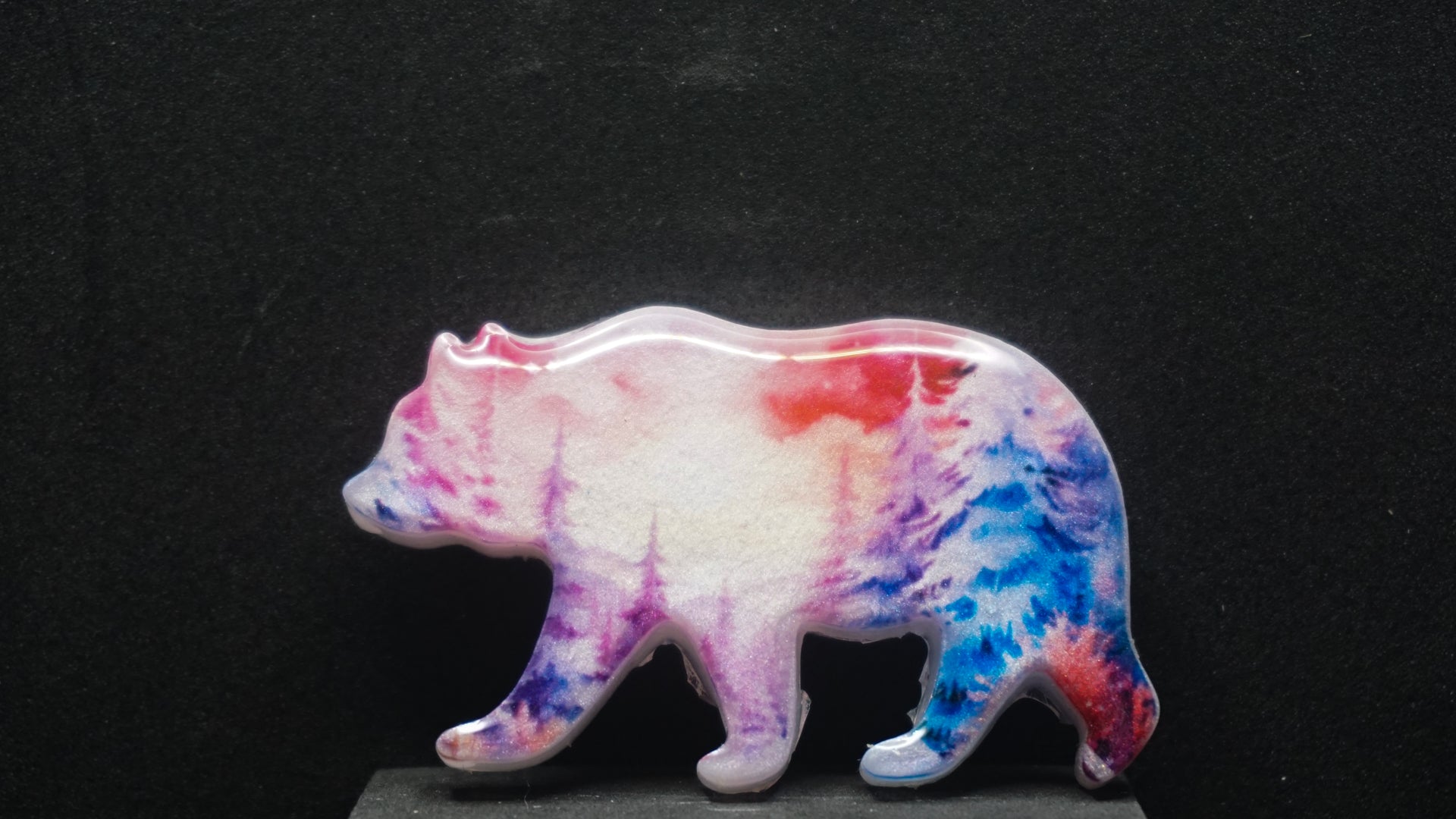 All of our pieces are resin based, featuring a variety of shimmery/sparkly mica backdrops, alcohol ink, and hand painted designs. At this time we are only including personalization on the back of the tag to not compete with the design. Most alcohol ink tags are backed in either black or white depending on what we feel works the best.