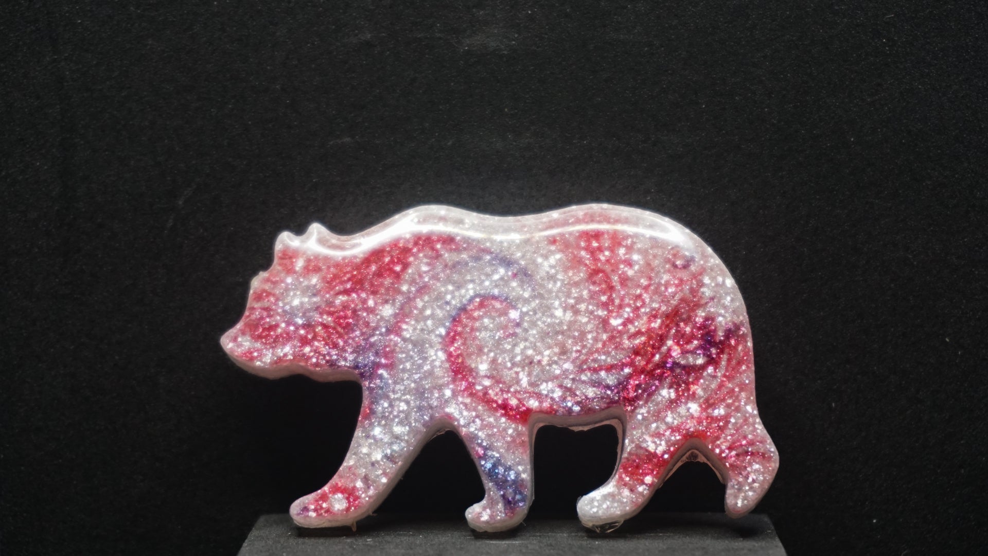 All of our pieces are resin based, featuring a variety of shimmery/sparkly mica backdrops, alcohol ink, and hand painted designs. At this time we are only including personalization on the back of the tag to not compete with the design. Most alcohol ink tags are backed in either black or white depending on what we feel works the best.