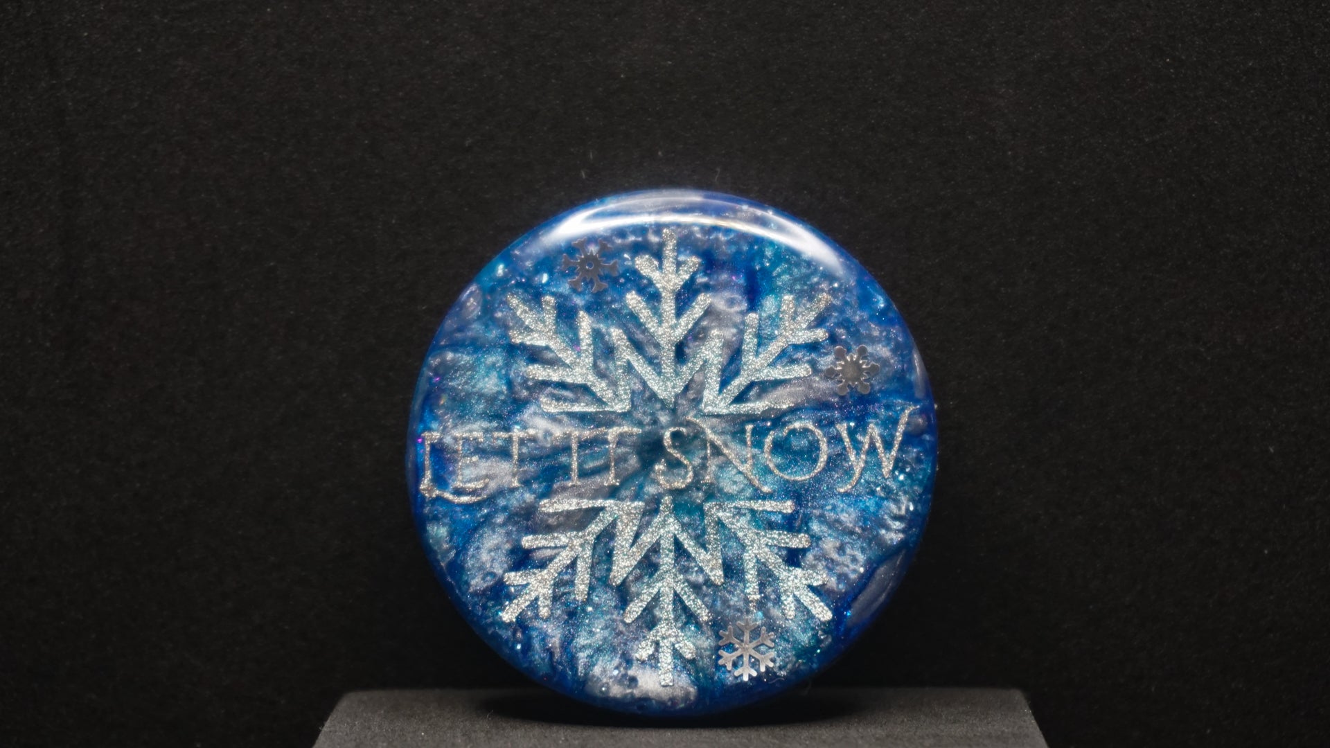 All of our pieces are resin based, featuring a variety of shimmery/sparkly mica backdrops, alcohol ink, and hand painted designs. At this time we are only including personalization on the back of the tag to not compete with the design. Most alcohol ink tags are backed in either black or white depending on what we feel works the best.