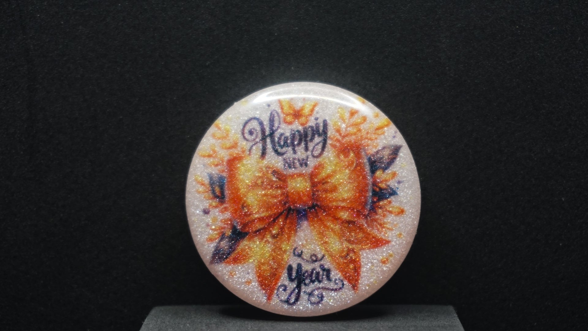 All of our pieces are resin based, featuring a variety of shimmery/sparkly mica backdrops, alcohol ink, and hand painted designs. At this time we are only including personalization on the back of the tag to not compete with the design. Most alcohol ink tags are backed in either black or white depending on what we feel works the best.