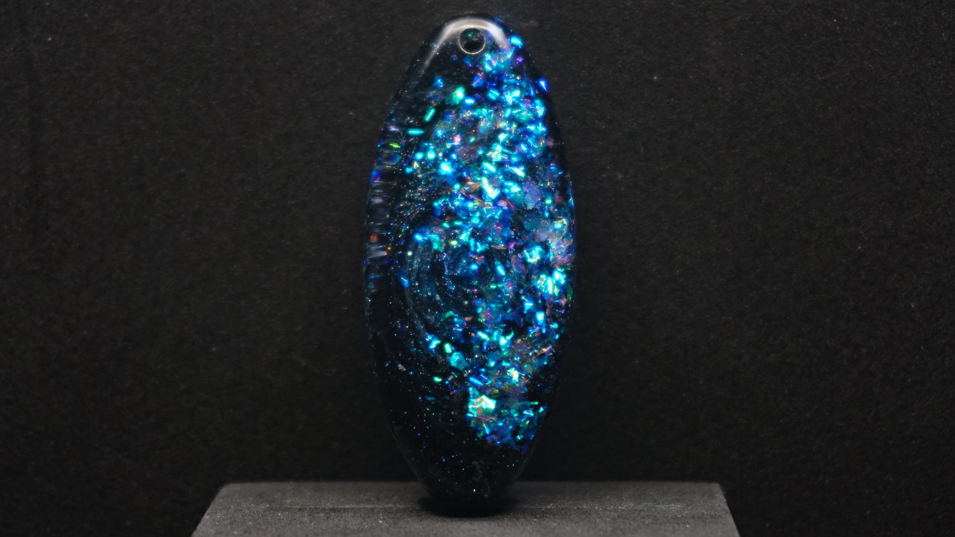 All of our pieces are resin based, featuring a variety of shimmery/sparkly mica backdrops, alcohol ink, and hand painted designs. At this time we are only including personalization on the back of the tag to not compete with the design. Most alcohol ink tags are backed in either black or white depending on what we feel works the best.