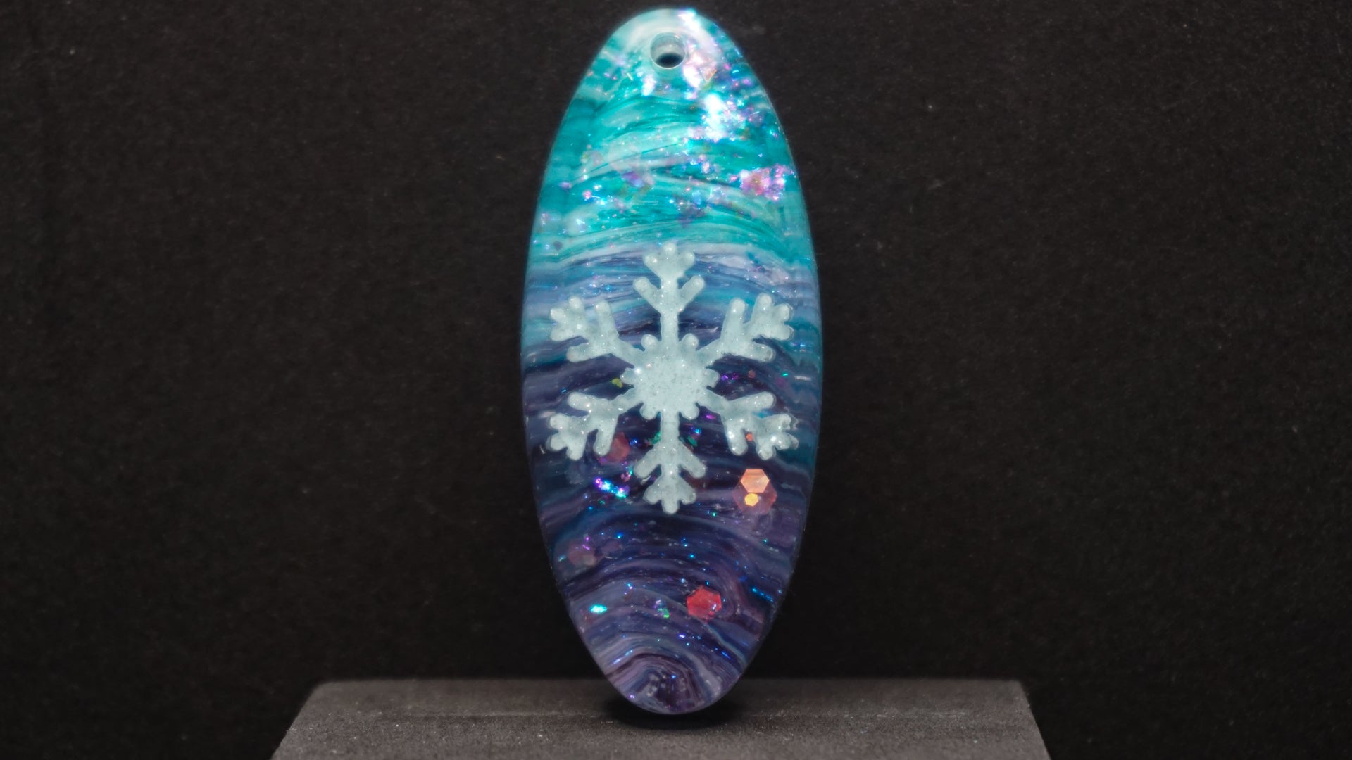 All of our pieces are resin based, featuring a variety of shimmery/sparkly mica backdrops, alcohol ink, and hand painted designs. At this time we are only including personalization on the back of the tag to not compete with the design. Most alcohol ink tags are backed in either black or white depending on what we feel works the best.