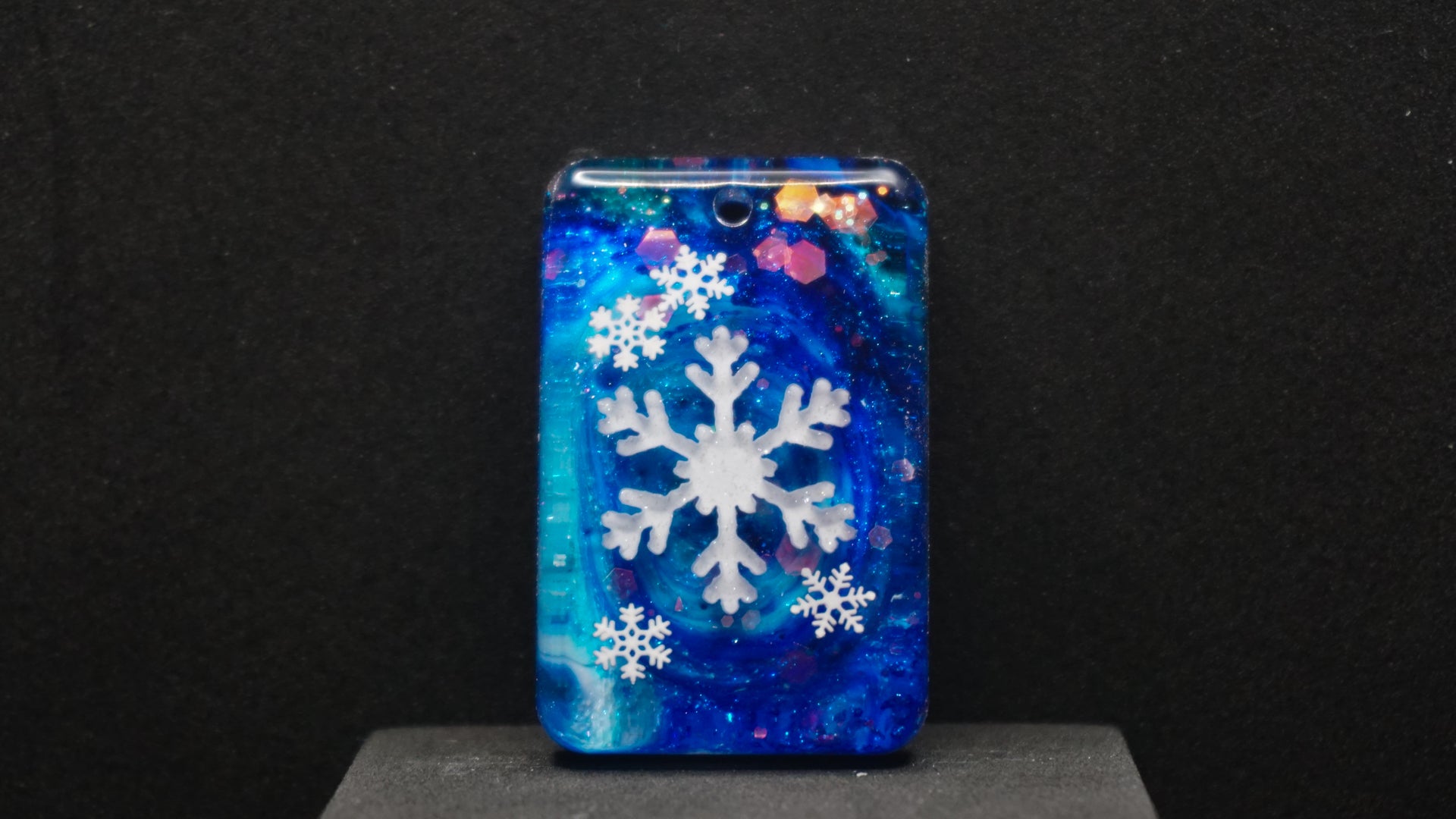 All of our pieces are resin based, featuring a variety of shimmery/sparkly mica backdrops, alcohol ink, and hand painted designs. At this time we are only including personalization on the back of the tag to not compete with the design. Most alcohol ink tags are backed in either black or white depending on what we feel works the best.