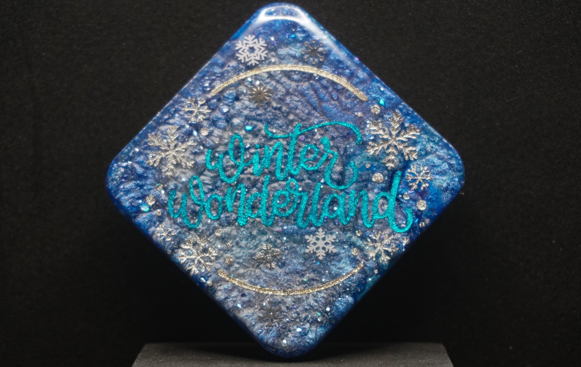 All of our pieces are resin based, featuring a variety of shimmery/sparkly mica backdrops, alcohol ink, and hand painted designs. At this time we are only including personalization on the back of the tag to not compete with the design. Most alcohol ink tags are backed in either black or white depending on what we feel works the best.