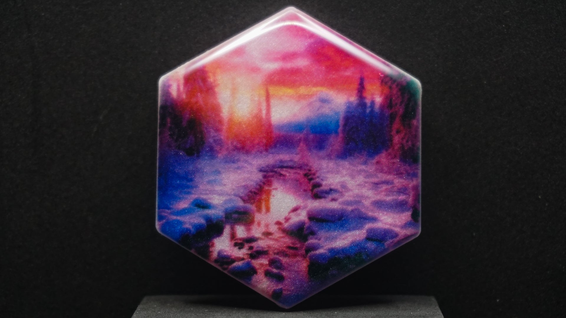 All of our pieces are resin based, featuring a variety of shimmery/sparkly mica backdrops, alcohol ink, and hand painted designs. At this time we are only including personalization on the back of the tag to not compete with the design. Most alcohol ink tags are backed in either black or white depending on what we feel works the best.