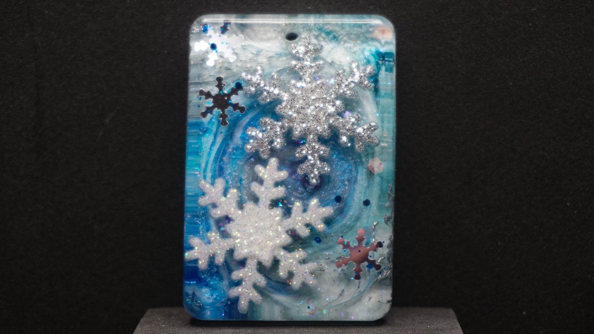 All of our pieces are resin based, featuring a variety of shimmery/sparkly mica backdrops, alcohol ink, and hand painted designs. At this time we are only including personalization on the back of the tag to not compete with the design. Most alcohol ink tags are backed in either black or white depending on what we feel works the best.
