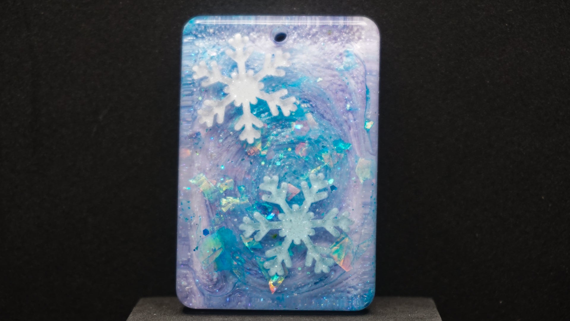 All of our pieces are resin based, featuring a variety of shimmery/sparkly mica backdrops, alcohol ink, and hand painted designs. At this time we are only including personalization on the back of the tag to not compete with the design. Most alcohol ink tags are backed in either black or white depending on what we feel works the best.
