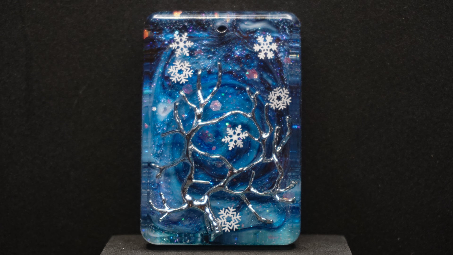 All of our pieces are resin based, featuring a variety of shimmery/sparkly mica backdrops, alcohol ink, and hand painted designs. At this time we are only including personalization on the back of the tag to not compete with the design. Most alcohol ink tags are backed in either black or white depending on what we feel works the best.