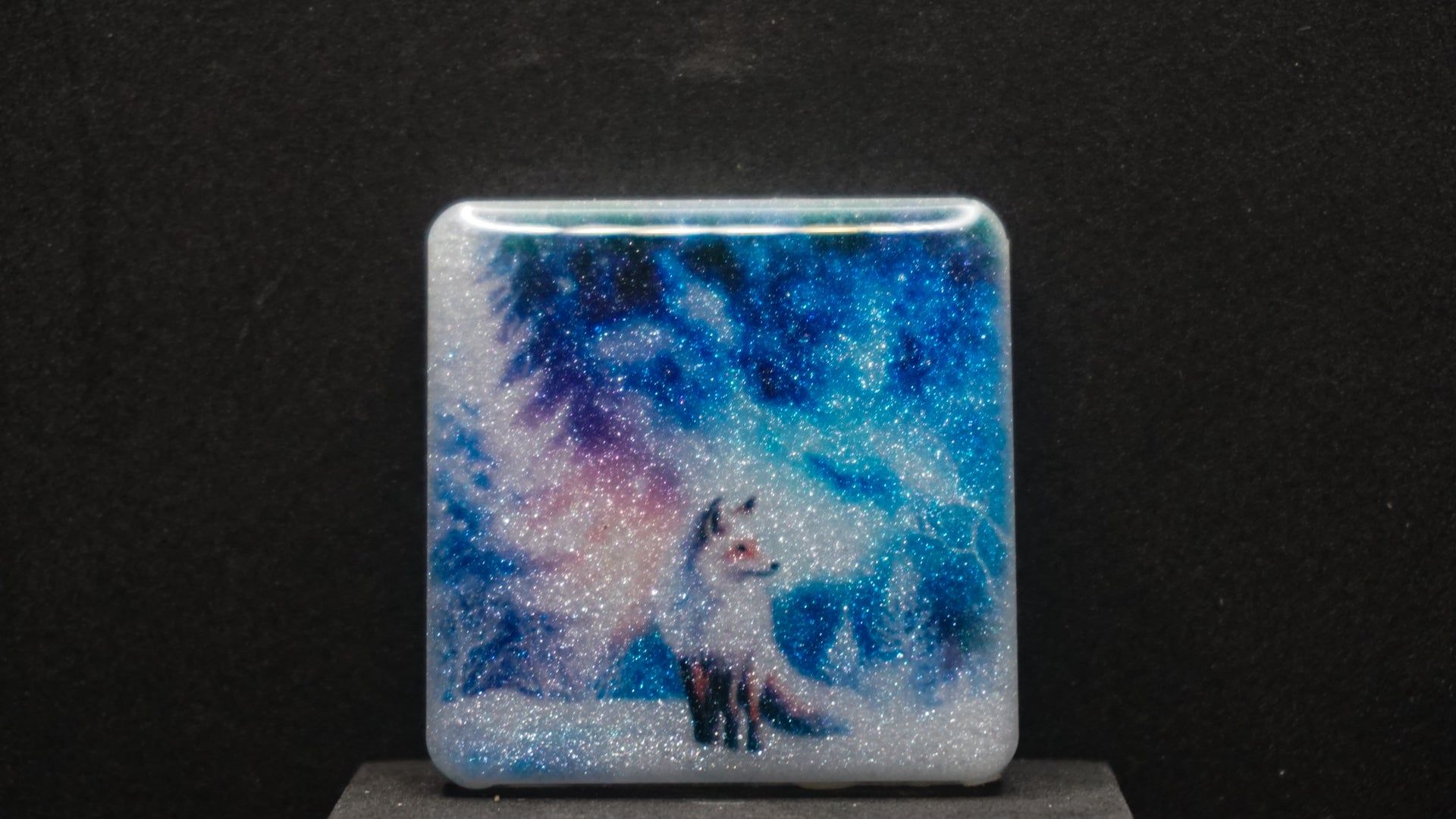 All of our pieces are resin based, featuring a variety of shimmery/sparkly mica backdrops, alcohol ink, and hand painted designs. At this time we are only including personalization on the back of the tag to not compete with the design. Most alcohol ink tags are backed in either black or white depending on what we feel works the best.