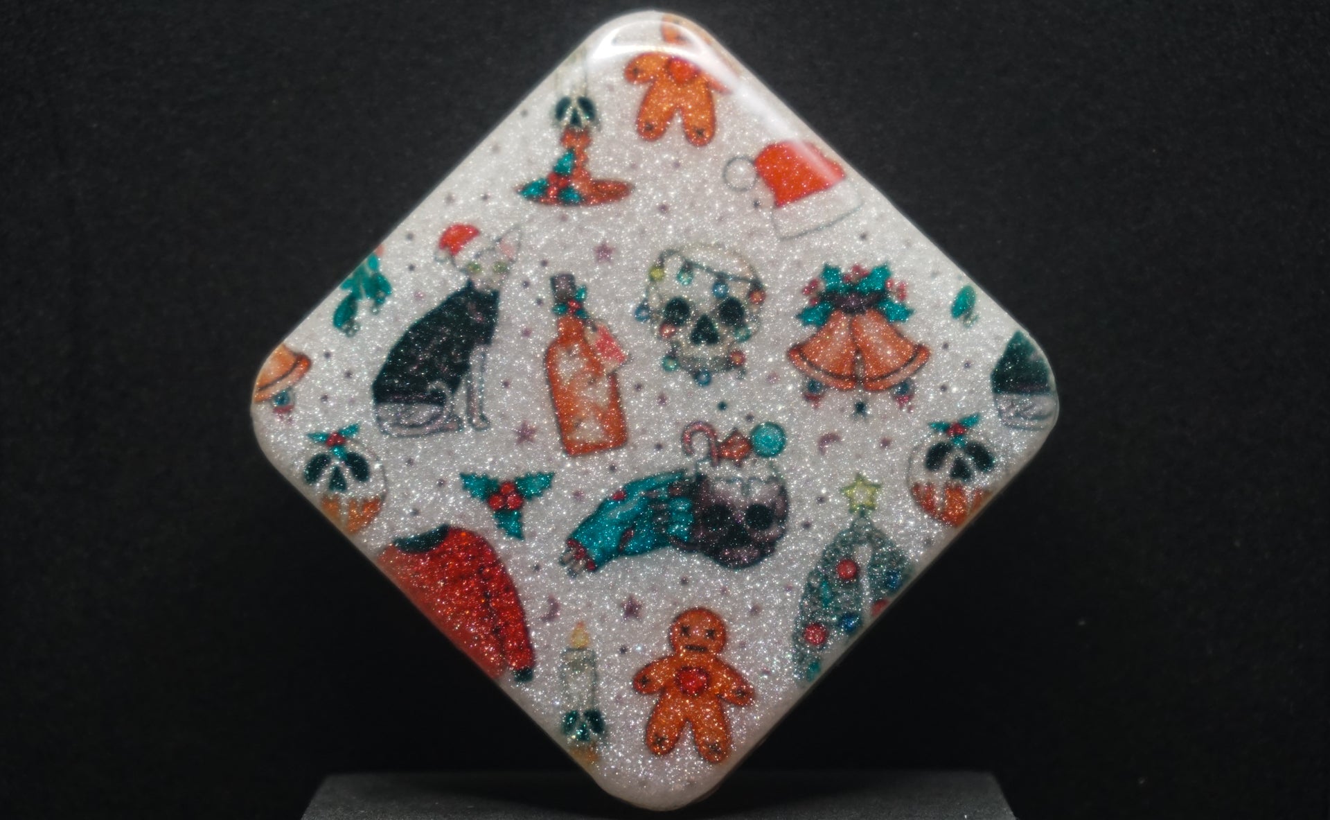 Express yourself, and your pet, with fun images on a shimmery or sparkly white mica resin backdrop. Our resin pieces range from a subtle shimmer to a bold sparkle. At this time we are only including personalization on the back of the tag to not compete with the design.