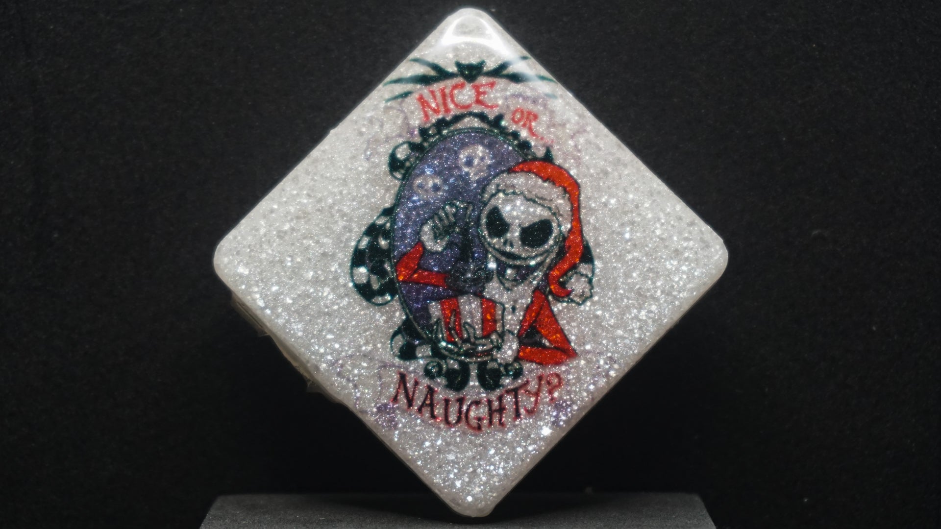 All of our pieces are resin based, featuring a variety of shimmery/sparkly mica backdrops, alcohol ink, and hand painted designs. At this time we are only including personalization on the back of the tag to not compete with the design. Most alcohol ink tags are backed in either black or white depending on what we feel works the best.